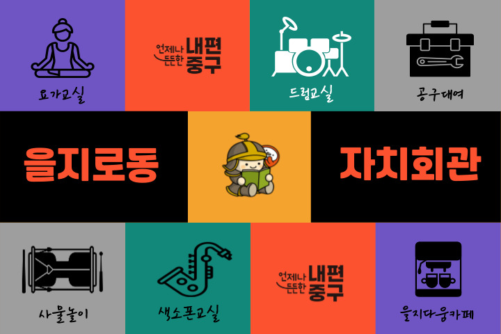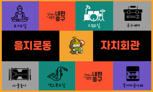 - 내용★자치회관 프로그램(드럼교실)★ 1. 시간 : 월, 수 16:30~19:30 2. 장소 : 을지로동주민센터 지하1층 강당 3. 신청방법 ➀ 방문 신청 : 을지로동주민센터 2층 ➁ 온라인 신청 : AI 내편중구, 자치회관 프로그램 홈페이지 ➂ 이메일신청 : jg047@seoul.go.kr 4. 수강료 : 수강료 9만원(3개월) 5. 수강료 감면대상자 ➀ (중구민만 100% 감면) 65세 이상 어르신, 기초생활수급자, 저소득한부모가족, 등록장애인 ➁ (중구민, 타구민 모두 100% 감면)국가유공자/독립유공자 본인 및 그 유족 6. 구비서류 ➀ 신분증 제시 ➁ 감면대상 증빙서류 - 65세 이상 어르신 : (결제일 발급받은)초본 - 기초생활수급자, 저소득한부모가족, 등록장애인, 국가유공자 등은 관련 서류 7. 수강료 결제 : 카드 및 현금(주민센터 방문), 계좌이체 8. 계좌번호 : 우리은행 1006-701-374843 (예금주 : 을지로동주민자치위원회) 9. 문의 : 02-3396-6695 ※ 우선순위: ➀을지로동주민 ➁을지로동생활권자 ➂중구민 ➃타구민(동일순위에서는 선착순)