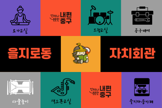 - 내용★자치회관 프로그램(사물놀이)★ 1. 시간 : 월, 수 13:00~15:00 2. 장소 : 을지로동주민센터 지하1층 강당 3. 신청방법 ➀ 방문 신청 : 을지로동주민센터 2층 ➁ 온라인 신청 : AI 내편중구, 자치회관 프로그램 홈페이지 ➂ 이메일신청 : jg047@seoul.go.kr 4. 수강료 : 수강료 9만원(3개월) 5. 수강료 감면대상자 ➀ (중구민만 100% 감면) 65세 이상 어르신, 기초생활수급자, 저소득한부모가족, 등록장애인 ➁ (중구민, 타구민 모두 100% 감면) 국가유공자/독립유공자 본인 및 그 유족 6. 구비서류 ➀ 신분증 제시 ➁ 감면대상 증빙서류 - 65세 이상 어르신 : (결제일 발급받은)초본 - 기초생활수급자, 저소득한부모가족, 등록장애인, 국가유공자 등은 관련 서류 7. 수강료 결제 : 카드 및 현금(주민센터 방문), 계좌이체 8. 계좌번호 : 우리은행 1006-701-374843 (예금주 : 을지로동주민자치위원회) 9. 문의 : 02-3396-6695 ※ 우선순위: ➀을지로동주민 ➁을지로동생활권자 ➂중구민 ➃타구민(동일순위에서는 선착순)