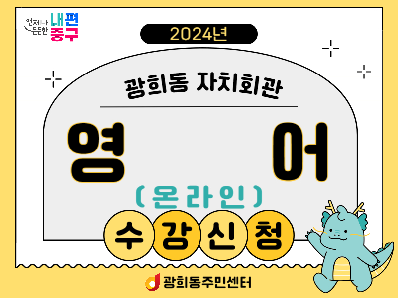 - 내용- 운영시간 : 화, 목 10:00 ~ 12:00 - 수업장소 : 온라인 화상수업 - 수 강 료 : 분기별 60,000원(월 2만원) - 참고사항 : 별도 교재 구입 필요 - 결제방법 : 광희동 주민센터 2층 주민행정팀 방문(카드, 현금) or 계좌이체 * 계좌번호 : 우리은행 1006-201-334682(예금주 : 광희동주민자치위원회) 감면혜택 적용 필요 시 ★★증빙서류 구비 필수(미첨부시 감면 적용이 불가능합니다)★★ - 65세 이상 중구민 감면 혜택 : 주민등록등초본 - 기초생활수급자, 저소득한부모가족, 등록장애인, 국가유공자/독립유공자 본인 및 유족&가족 : 해당 증빙 서류(수급자 증명서, 유공자증 및 복지카드 등)