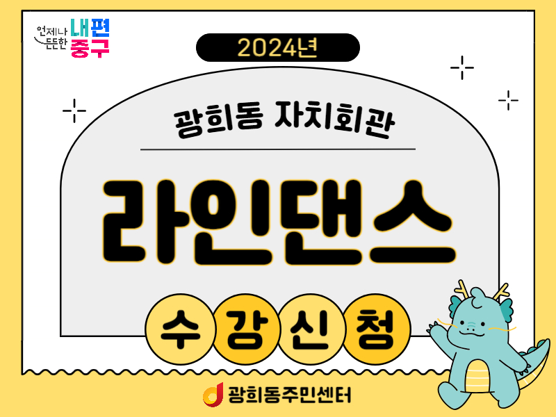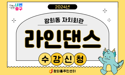 - 내용***** 정원 초과로 3분기 접수 마감되었습니다 ***** - 운영시간 : 수, 금 18:30 ~ 20:30 - 수업장소 : 광희동 자치회관 지하1층 다목적실(퇴계로 303-9) - 수 강 료 : 분기별 90,000원(월 3만원) - 결제방법 : 광희동 주민센터 2층 주민행정팀 방문(카드, 현금) or 계좌이체 * 계좌번호 : 우리은행 1006-201-334682(예금주 : 광희동주민자치위원회) 감면혜택 적용 필요 시 ★★증빙서류 구비 필수(미첨부시 감면 적용이 불가능합니다)★★ - 65세 이상 중구민 감면 혜택 : 주민등록등초본 - 기초생활수급자, 저소득한부모가족, 등록장애인, 국가유공자/독립유공자 본인 및 유족&가족 : 해당 증빙 서류(수급자 증명서, 유공자증 및 복지카드 등)