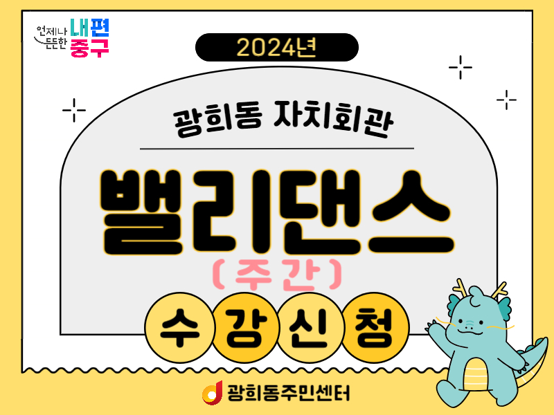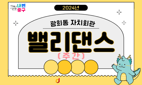 - 내용- 운영시간 : 화, 목 15:00 ~ 16:30 - 수업장소 : 광희동 자치회관 지하1층 다목적실(퇴계로 303-9) - 수 강 료 : 분기별 90,000원(월 3만원) - 결제방법 : 광희동 주민센터 2층 주민행정팀 방문(카드, 현금) or 계좌이체 * 계좌번호 : 우리은행 1006-201-334682(예금주 : 광희동주민자치위원회) 감면혜택 적용 필요 시 ★★증빙서류 구비 필수(미첨부시 감면 적용이 불가능합니다)★★ - 65세 이상 중구민 감면 혜택 : 주민등록등초본 - 기초생활수급자, 저소득한부모가족, 등록장애인, 국가유공자/독립유공자 본인 및 유족&가족 : 해당 증빙 서류(수급자 증명서, 유공자증 및 복지카드 등)