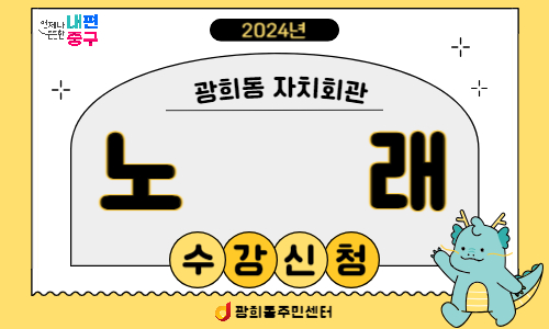 - 내용- 운영시간 : 화 14:00 ~ 16:00 - 수업장소 : 광희동 자치회관 5층 대강당(퇴계로 303-9) - 수 강 료 : 분기별 60,000원(월 2만원) - 결제방법 : 광희동 주민센터 2층 주민행정팀 방문(카드, 현금) or 계좌이체 * 계좌번호 : 우리은행 1006-201-334682(예금주 : 광희동주민자치위원회) 감면혜택 적용 필요 시 ★★증빙서류 구비 필수(미첨부시 감면 적용이 불가능합니다)★★ - 65세 이상 중구민 감면 혜택 : 주민등록등초본 - 기초생활수급자, 저소득한부모가족, 등록장애인, 국가유공자/독립유공자 본인 및 유족&가족 : 해당 증빙 서류(수급자 증명서, 유공자증 및 복지카드 등)