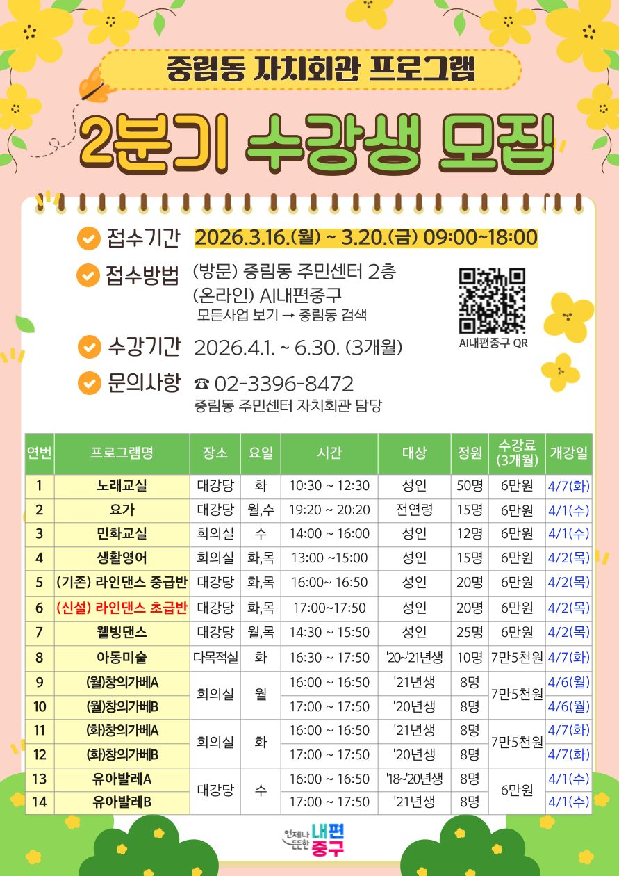 - 내용2026년 2분기(4~6월) 중림동 자치회관 프로그램 안내 □ 신청기간 : 2026. 3. 16.(월) ~ 3. 20.(금) ※ 심사를 통해 수강이 확정됨 (문자 통지 : 3/23(월)) □ 신청방법 : 방문 신청 또는 온라인 신청 - 방 문 신청 : 신분증 지참 - 온라인 신청 : AI내편중구 사이트 (모든 사업보기 → 중림동 검색) ※ 온라인 신청자는 수강확정 문자 받은 후 주민센터 방문하여 신분증 제시 □ 수강료 납부기간 : 3. 23.(월) 수강 확정 문자 받은 후부터 첫 수업 전까지 수강료 납부 □ 수강료 납부방법 : 카드결제 또는 계좌이체 □ 수강기간 : 2026. 04. 01. ~ 2026. 06. 30. [3개월]