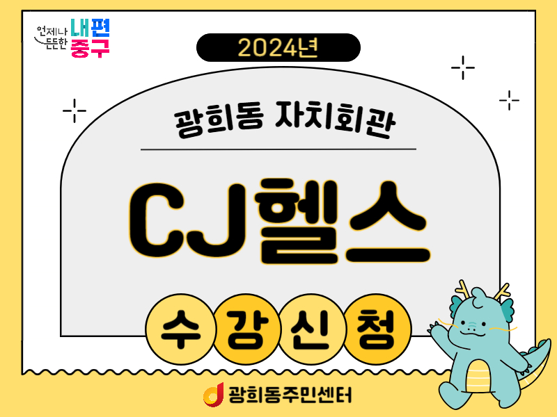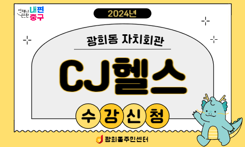 - 내용- 수강기간 : 2024. 7. 1. ~ 12. 31. (6개월) - 운영시간 : (월~금) 06:00 ~ 21:30 ※ 토, 일요일 및 공휴일 등 휴관 - 수 강 료 : 180,000원 (일시납) * 납부 방법 : 카드(주민센터 방문 필요), 현금, 계좌이체 - 선발인원 : 30명 - 주 소 : 서울특별시 중구 동호로 330 2층(CJ제일제당) - 신청서 1부, 2024년 6월 중 발급된 주민등록초본(나이 및 광희동 거주 확인용) ※ 주민등록초본 첨부 필수(미첨부 시 무효처리 되오니, 꼭 첨부 부탁드립니다.)