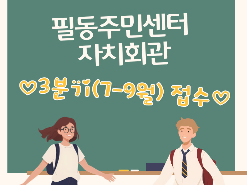 - 신청절차#신청절차 1. 신청일정 : 분기별 접수 (매분기 시작전 20일부터 일주일간(★6월 20일 ~ 26일) ) 2. 신청방법 ➀ 온라인 접수(AI내편중구) ➁ 방문 접수(필동주민센터 1층 주민행정팀) 3. 심사 이후 접수 가능여부 개별연락 ➀ 정원 초과 접수 시 우선순위에 따라 접수 순위 부여 (1순위: 중구민&생활권자 - 2순위: 타구민) ➁ 동일 순위 내 선착순 4. 개별연락 받은 접수가능자는 문자 안내받은 계좌입금 또는 <필동주민센터 1층 주민행정팀> 방문 결제 완료 후 프로그램 수강 가능