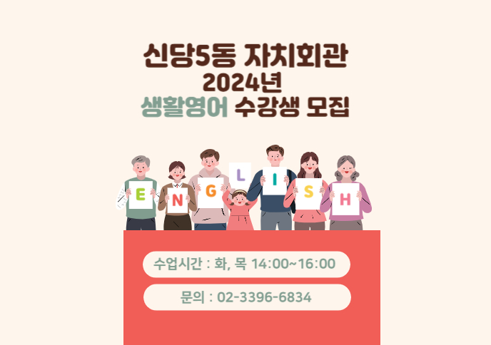 - 내용★기본 생활회화를 재미있게 배울 수 있는 강의 ※ 감면대상자의 경우 프로그램 수강료 결제 시 신분증과 증빙서류 제출 필요 ▷국가유공자의 경우: 신분증과 국가보훈등록증, 국가유공자유족증, 국가유공자증, 국가유공자증명서 등 국가유공자와 그 유족임을 증명하는 증빙서류 한가지 ▷기초생활수급자의 경우: 신분증과 기초생활수급자증명서 ▷장애인의 경우: 신분증과 장애인 증명서 또는 복지카드 ▷저소득 모·부자 가정의 경우: 신분증과 한부모가족 증명서 ▷경로우대자의 경우: 신분증과 (결제일에 발급받은)주민등록초본 ▷다둥이 가정 부모 · 자녀인 경우 : 다둥이행복카드 또는 가족관계증명서 ▷중구 토박이인 경우: 토박이증
