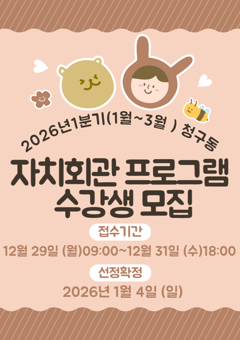 - 신청절차1. 온라인 접수 또는 방문 접수 (방문 접수 가능 시간 : 09시~18시) * (온라인, 오프라인) 신청서 접수 → (주민센터) 심사 → (주민센터) 수강 대상자 통보 → (수강생) 수강료 결제 → 수강확정 2. 선정순위에 따른 심사 * 1순위 : 청구동 주민 * 2순위 : 중구민, 생활권자 * 3순위 : 타구민등 3. 심사후 수강 확정자 개별연락(문자) 4. 주민센터 방문 및 수강료 결제