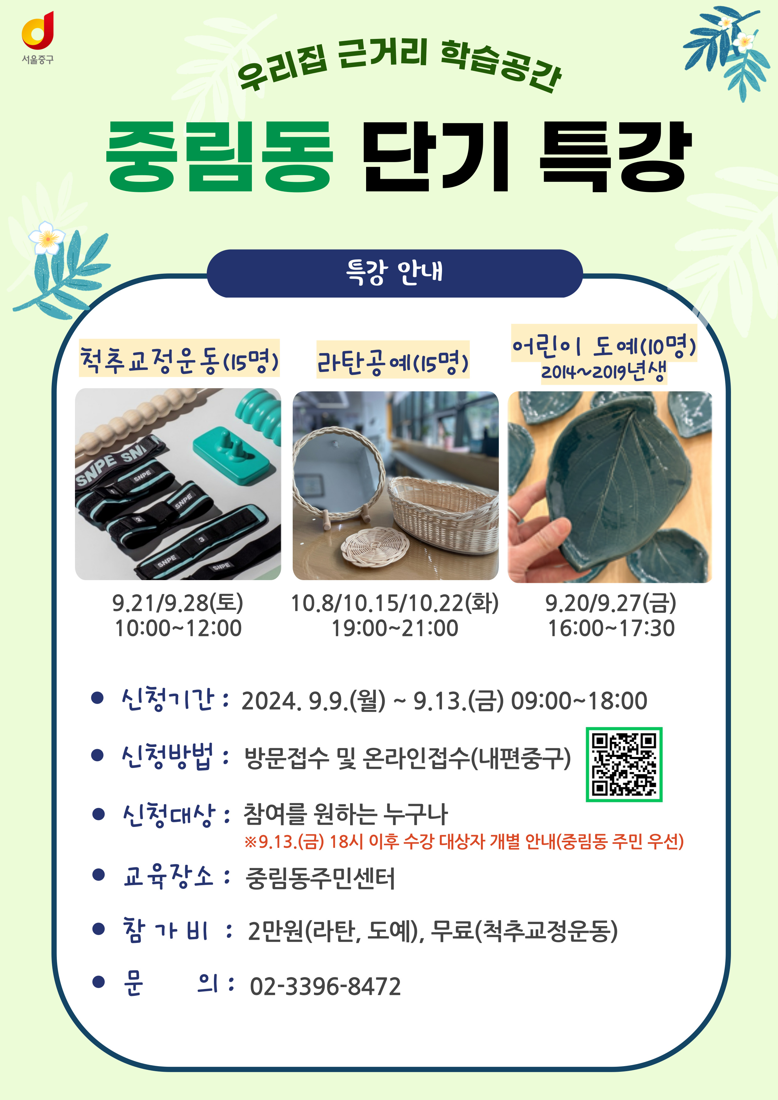 - 내용<2024 중림동 단기 특강 신청 안내> ★ 신청기간 : 2024. 9. 9.(월) ~ 9. 13.(금) 09:00~18:00 ★ 신청방법 : 방문(중림동주민센터) 및 온라인(내편중구) 1. 척추교정운동(SNPE) : 9. 21/ 9. 28 (토) 10:00~12:00 지하 강당 [정원 15명] 2. 라탄공예 : 10. 8/ 10. 15./ 10. 22 (화) 19:00~21:00 3층 회의실 [정원 15명] 3. 어린이 도예(2014~2019년생) : 9. 20/ 9. 27 (금) 16:00~17:30 1층 다목적실 [정원 10명]