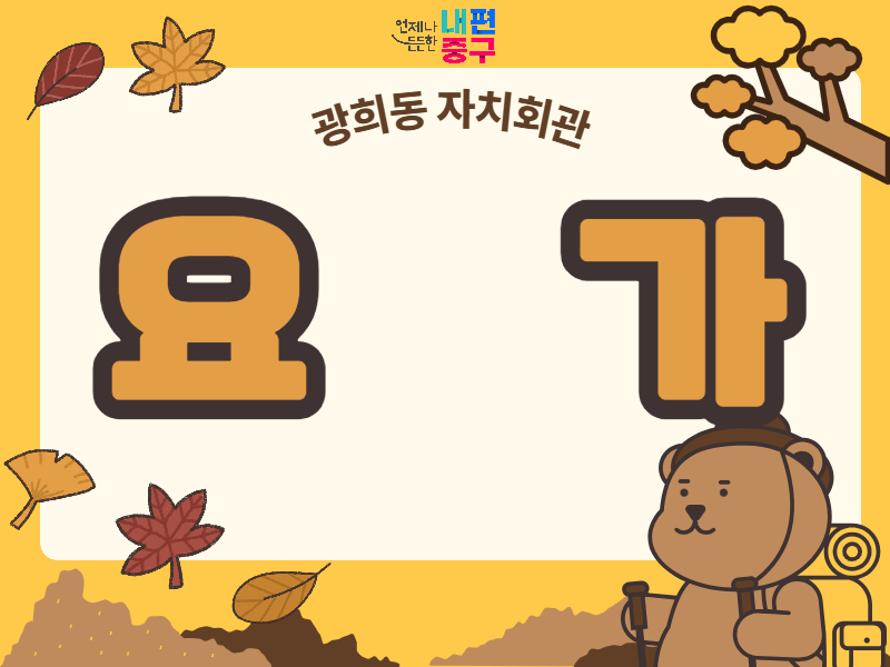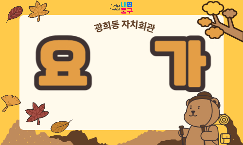 - 내용- 운영시간 : 월, 수, 금 12:00 ~ 13:30 - 수업장소 : 광희동 자치회관 지하1층 다목적실(퇴계로 303-9) - 수 강 료 : 분기별 60,000원(월 2만원) - 결제방법 : 광희동 주민센터 1층 주민행정팀 방문(카드, 현금) or 계좌이체 * 계좌번호 : 우리은행 1006-201-334682(예금주 : 광희동주민자치위원회) 감면혜택 적용 필요 시 ★★증빙서류 구비 필수(미첨부시 감면 적용이 불가능합니다)★★ - 65세 이상 중구민 감면 혜택 : 주민등록초본 - 기초생활수급자, 저소득한부모가족, 등록장애인, 국가유공자/독립유공자 본인 및 유족&가족 : 해당 증빙 서류(수급자 증명서, 유공자증 및 복지카드 등)
