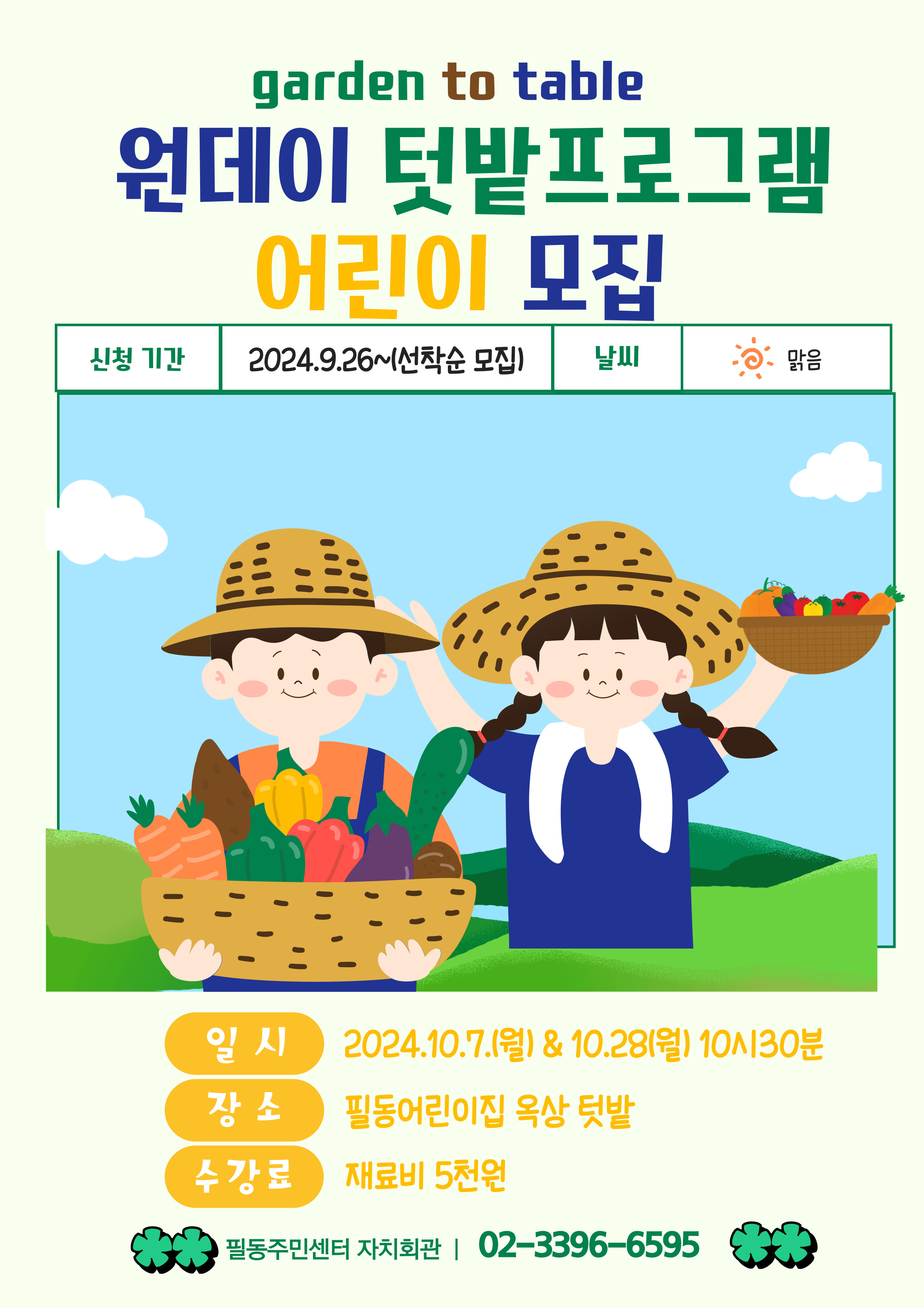 - 내용원데이 텃밭 프로그램에 참여할 어린이를 모집합니다 :) 어린이집 옥상에 조성된 텃밭을 활용하여 어린이들 자연체험 프로그램을 운영하고 있습니다. 도시 녹화에 도움을 주고 ,수확한 농작물은 어려운 이웃과 나누는 사랑을 실천하고자 합니다. 운영장소 : 필동어린이집 옥상 (퇴계로 36가길 60) 신청방법 : 주민센터 방문 및 전화문의, AI내편중구 접수 수강료 : 5천원(재료비)