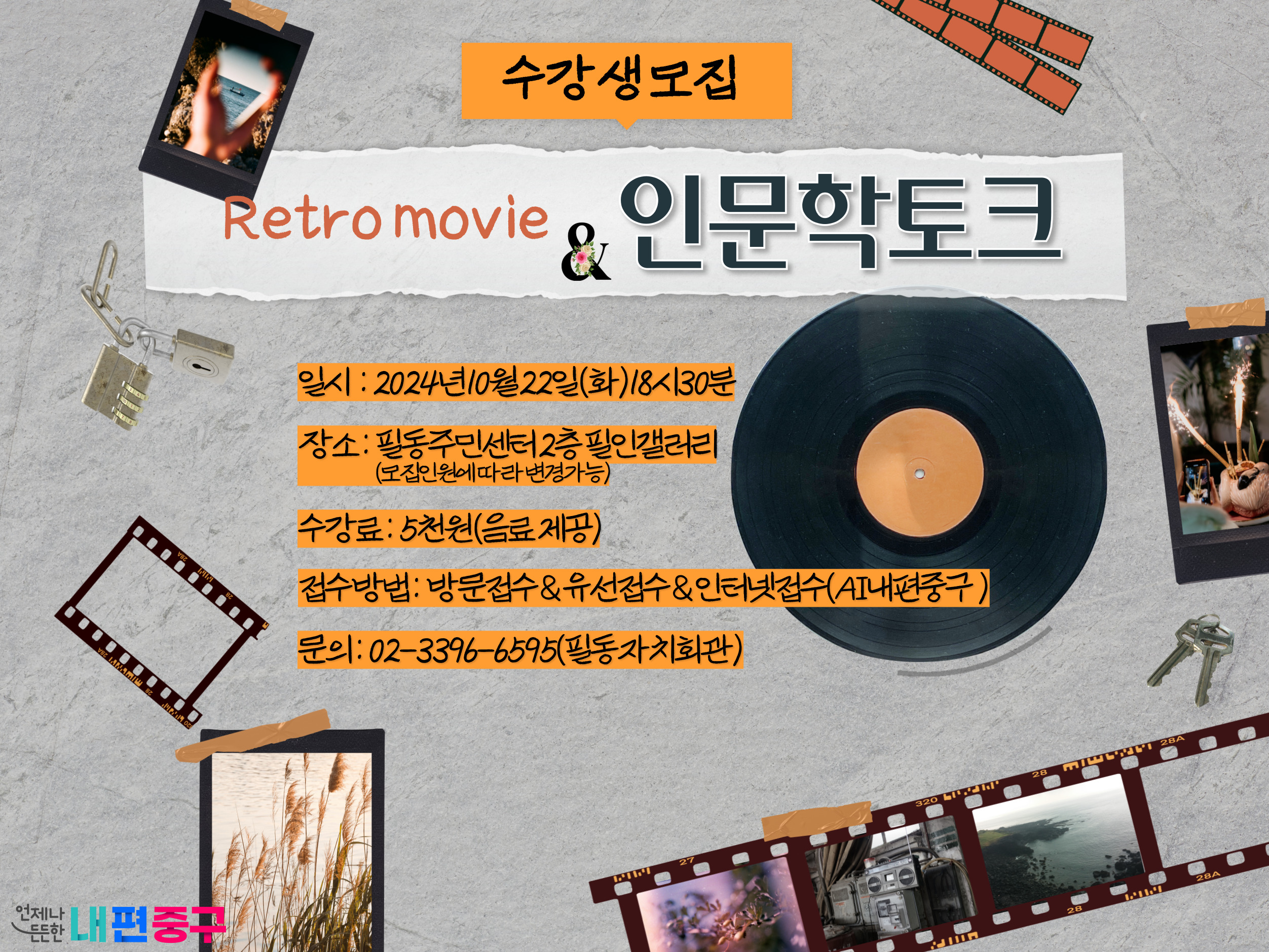- 내용<레트로 무비 페스타> 레트로 무비 인문학토크 수강생을 모집합니다. 일시 : 2024년 10월 22일(화) 18시 30분 장소 : 필동주민센터 2층 필인갤러리 (*모집인원에 따라 변경가능) 수강료 : 5천원 (음료제공) 접수방법 : 방문접수 & 유선접수 & 인터넷접수 (AI내편중구) 문의 : 02-3396-6595 (필동 자치회관 주민행정팀)