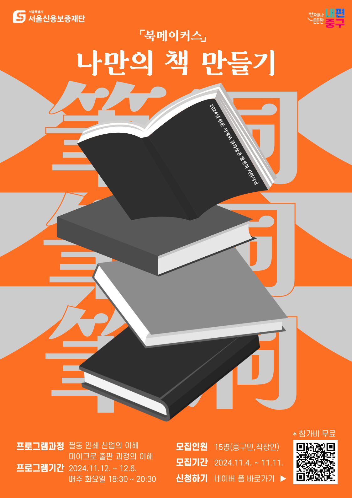 - 내용일상이 책이 되는 ‘북메이커스’ 지난 봄 <북메이커스> 수업에 이어 가을에 다시 한번 돌아왔습니다. 프로그램 : 필동 인쇄 산업의 이해 / 나만의 책 만들기 프로그램 기간 : 24.11.12 ~ 12.6. 매주 화 18:30 - 20:30 활동장소 : 필동주민센터 2층 필인갤러리 (대면 4회, 비대면 2회) 모집인원 : 15명 (필동 지역주민 및 인근 직장인 누구나) 모집기간 : 11월 4일 - 11일 12시까지 선정발표 : 11.11(월) 17시 이후 개별연락 신청방법 : 네이버폼 작성 (참가비 무료)