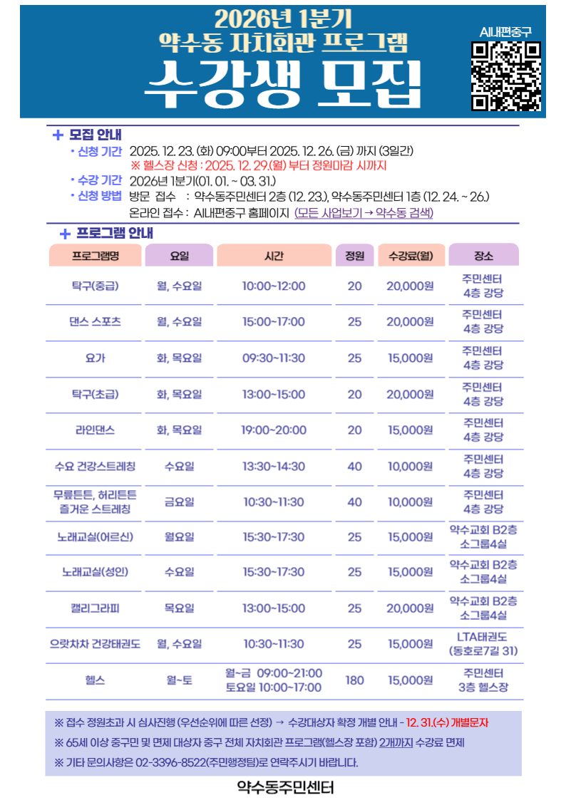 - 신청절차★2026. 1분기(1월~3월)★ 1. 접수일 : 12월23일(화) 9:00부터 12월26일(금) 18:00까지(3일간) 2. 신청방법 - 온라인 접수(AI내편중구) : 12.23.(화) 9:00부터 수강신청 버튼 생성 - 방문 접수(23일: 주민센터 2층 로비 / 24,26일: 1층 주민행정팀) 3. 프로그램 정원초과 접수 시 심사 후 등록여부 결과안내 : 2025. 12. 31.(수) 문자 통보 4. 등록문자 받으신 분은 방문결제 후 프로그램 수강 확정