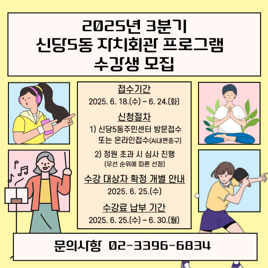 - 내용* 힐링필라테스 수업안내 7월 신규 프로그램입니다!! * 상황에 따라 변동될 수 있음 /수강생 미달시 개설이 안될 수 있음 수업시간 : 매주 월 오후 7시~8시 수업장소 : 신당5동주민센터 지하 다목적실 수업기간 : 2025년 7월~9월 수 강 료 : 60,000원(3개월)