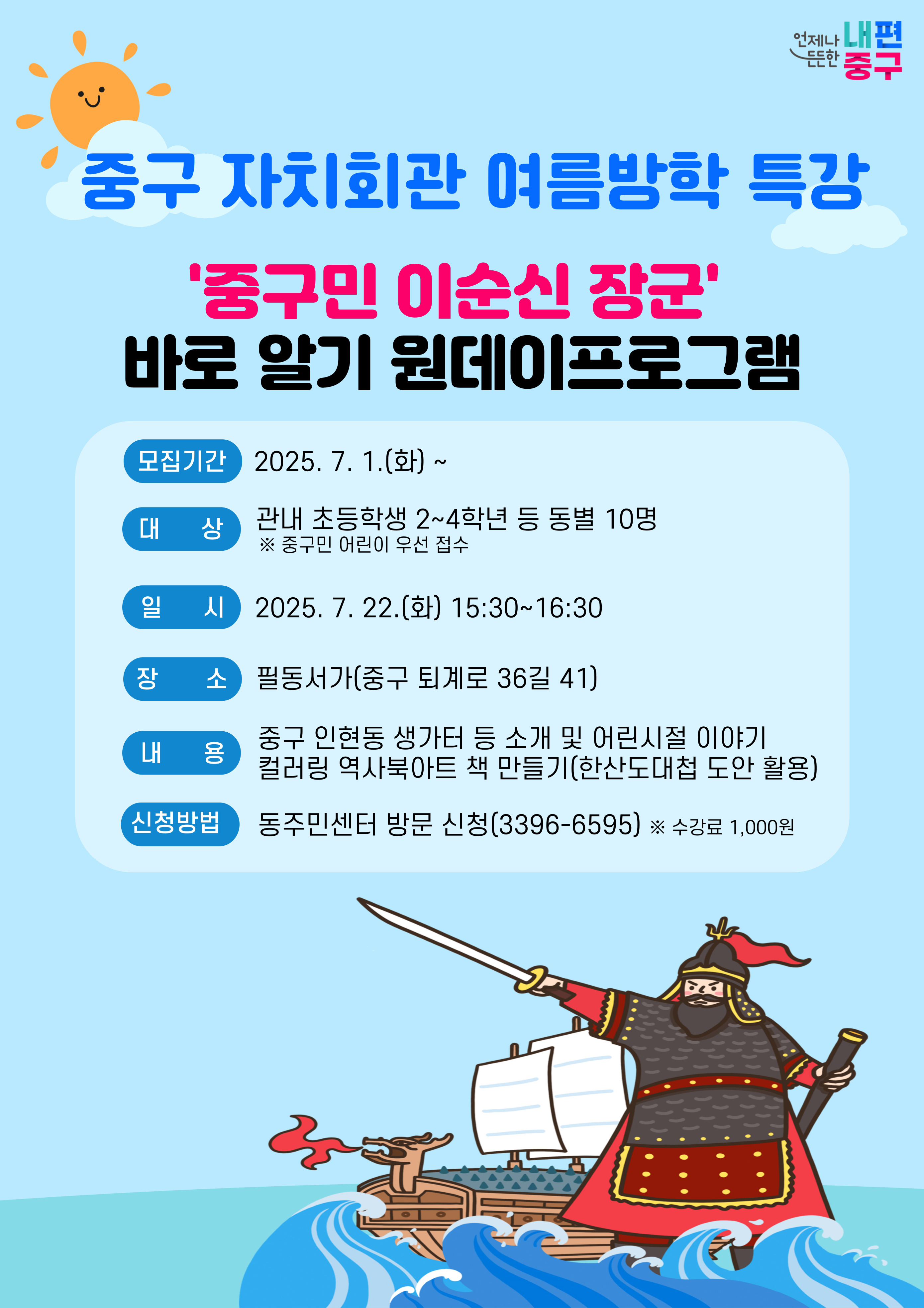 - 내용[ 중구민(어린이) 이순신 장군 바로알기 원데이프로그램 ] ○ 모집기간 : 2025. 7. 1.(화) ~ 신청 마감시 ○ 모집대상 : 관내 초등학생 2~4학년 10명(모집대상 외 문의 가능) ○ 일 시 : 2025. 7. 22.(화) 15:30~16:30 ○ 장 소 : 필동서가(중구 퇴계로 36길 41) ○ 수업내용 - 이순신장군 중구 인현동 생가터 등 소개 및 어린시절 이야기 - 컬러링 역사북아트 책 만들기 ○ 신청방법 : ai 내편중구 / 필동주민센터 방문접수 ○ 수 강 료 : 1,000원 ○ 문 의 : 02-3396-6595