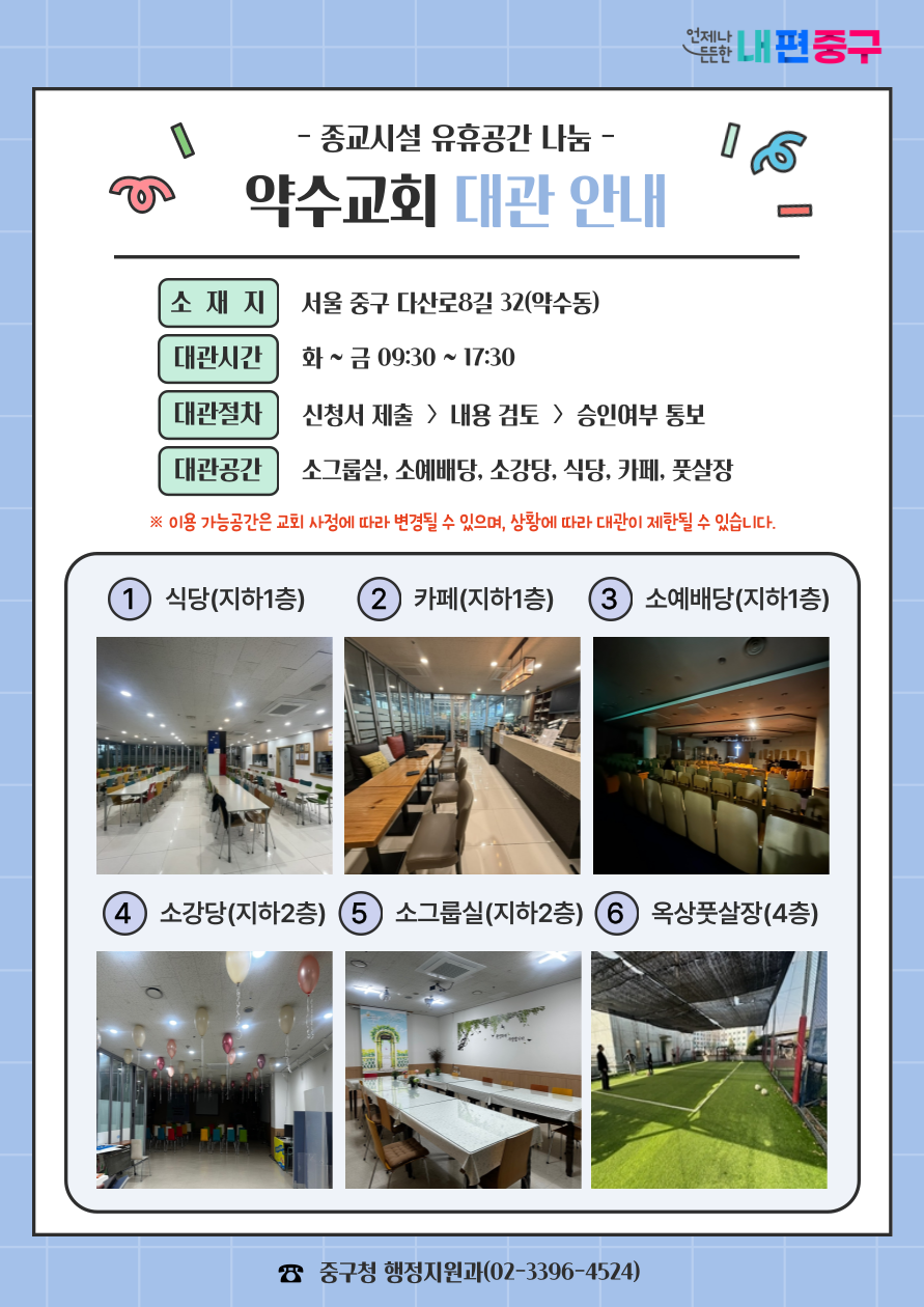 - 내용♥ 종교시설 유휴공간 지역나눔 ♥ 중구는 관내 종교시설과 협약하여 평일 종교시설 내 유휴공간을 지역 주민과 함께 공유하고 있습니다. 신청자께서는 아래의 이용자 수칙을 숙지하시고, 동의하실 경우 신청해 주시기 바랍니다. <사업 개요> 1. 신청가능시간 : 화 ~ 금 09:30 ~ 17:30 (※ 단, 종교시설에서 자체 일정이 있는 시간은 제외됩니다.) 2. 신청대상 : 중구민 누구나(개인, 모임, 단체 등) 3. 사용목적 : 건전한 주민 동아리 모임, 자조 모임, 봉사 활동, 품앗이 교육 등 ※ 승인결과는 신청자 문자 발송 예정입니다.