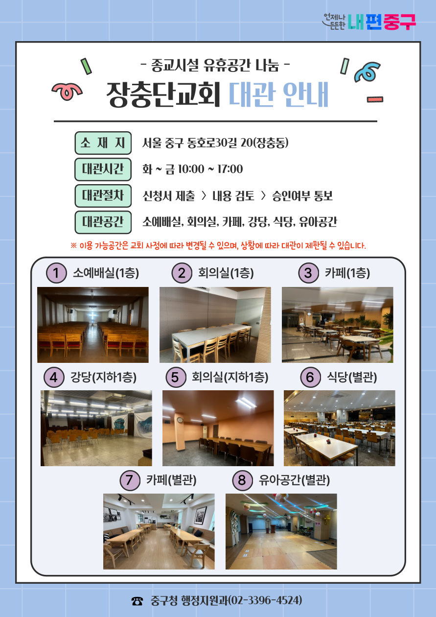 - 내용♥ 종교시설 유휴공간 지역나눔 ♥ 중구는 관내 종교시설과 협약하여 평일 종교시설 내 유휴공간을 지역 주민과 함께 공유하고 있습니다. 신청자께서는 아래의 이용자 수칙을 숙지하시고, 동의하실 경우 신청해 주시기 바랍니다. <사업 개요> 1. 신청가능시간 : 화 ~ 금 09:30 ~ 17:30 (※ 단, 종교시설에서 자체 일정이 있는 시간은 제외됩니다.) 2. 신청대상 : 중구민 누구나(개인, 모임, 단체 등) 3. 사용목적 : 건전한 주민 동아리 모임, 자조 모임, 봉사 활동, 품앗이 교육 등