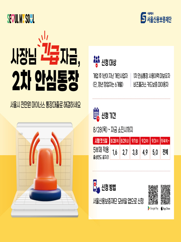 - 내용2025년 제2차 서울형 자영업자 안심통장 ○ 시행일자 : 2025년 8월 28일(목) ○ 사업내용 : 안심통장 특별보증서 발급을 통한 비대면 마이너스통장대출 1천만원 지원 ○ 지원대상 : 아래 요건을 모두 충족하는 서울시 소재 중소기업 및 소상공인 ① 업력 : 개업 후 1년 초과하는 개인사업자 ② 신용도 : 대표자 NICE 개인신용평점 600점 이상 ③ 매출액 : 최근 3개월간 매출 합계 2백만원 이상 또는 최근 1년분 신고매출 1천만원 이상 ※ 단, 상기 요건 충족하더라도 재단 및 은행 내부 규정(기준)에 의해 지원불가할 수 있음 ○ 대출금액 : 마이너스통장대출 1천만원 ○ 대출은행 : 우리은행, 카카오뱅크, 토스뱅크, 하나은행(가나다 순) ○ 상환조건 : 1년 만기 일시상환(1년 단위 기한연장, 최대 5년 한정) ○ 대출금리 : CD금리(91일) + 2.0% 이내 ○ 보증비율 : 90%(보증금액 9백만원) ○ 보증료율 : 연 1.0% ○ 중복지원제한 : 다음의 해당자는 중복지원 제한 ① 1차 안심통장 지원(이용) 이력 보유자 ② 정부 '소상공인 비즈플러스 카드보증', 지역신보 '카드·근보증' 잔액 보유자 ○ 청년 창업자, 노포 사업자에 대한 우대지원 ① 청년 창업자(연령 30대 이하, 업력 3년 미만) : 업력요건 완화(1년 → 6개월) ② 노포 사업자(연령 60대 이상, 업력 10년 이상) : 카드론·현금서비스 요건 완화 ○ 신청방법 : [서울신용보증재단 모바일앱]을 통한 비대면 보증신청
