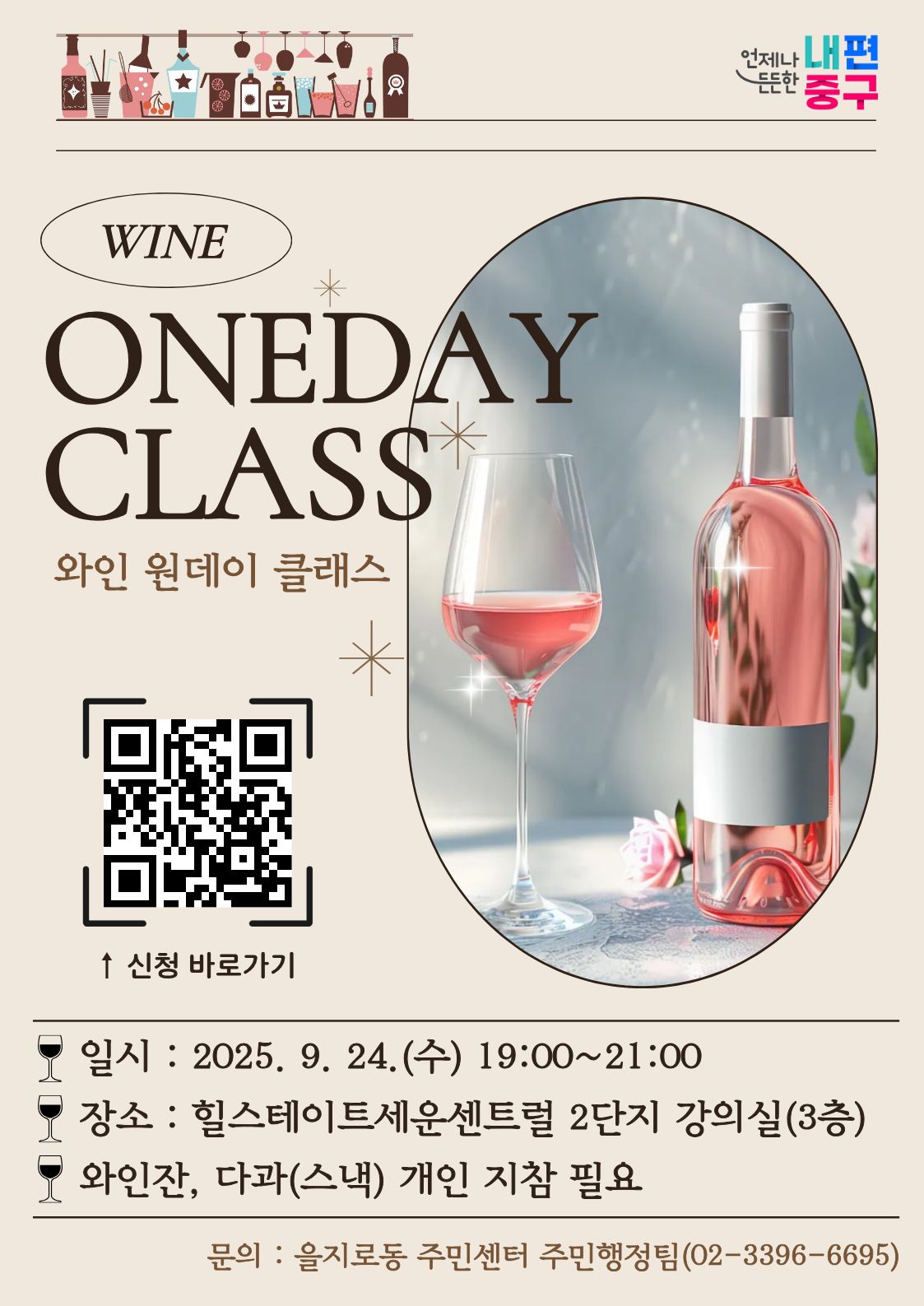 - 내용○ 일시 : 2025. 9. 24.(수) 19:00~21:00 ○ 장소 : 힐스테이트세운센트럴 2단지 강의실(3층) ○ 내용 : 와인에 대한 기초 배우기 및 와인 시음 ○ 모집기간 : 2025. 9. 17.(수) ~ 9. 19.(금) ○ 모집인원 : 을지로동 힐스테이트 입주민 성인 10명 ※ 선착순으로 조기 마감 가능 ○ 참여자 확정 통보 : 2025. 9. 22.(월) 개별 문자 통보 ○ 수강료 납부 - 금액 : 10,000원 - 납부기간 : 2025. 9. 22.(월) ~ 9. 23.(화) - 납부방법 : 계좌이체 ○ 참고사항 - 와인잔, 다과 개인 지참 필요 - 9. 23.(화)까지 신청 취소하셔야 수강료 전액 환불 가능 ○ 신청방법 : 아래 연결사이트(https://naver.me/G020mCzH) 접속하여 신청서 작성 제출