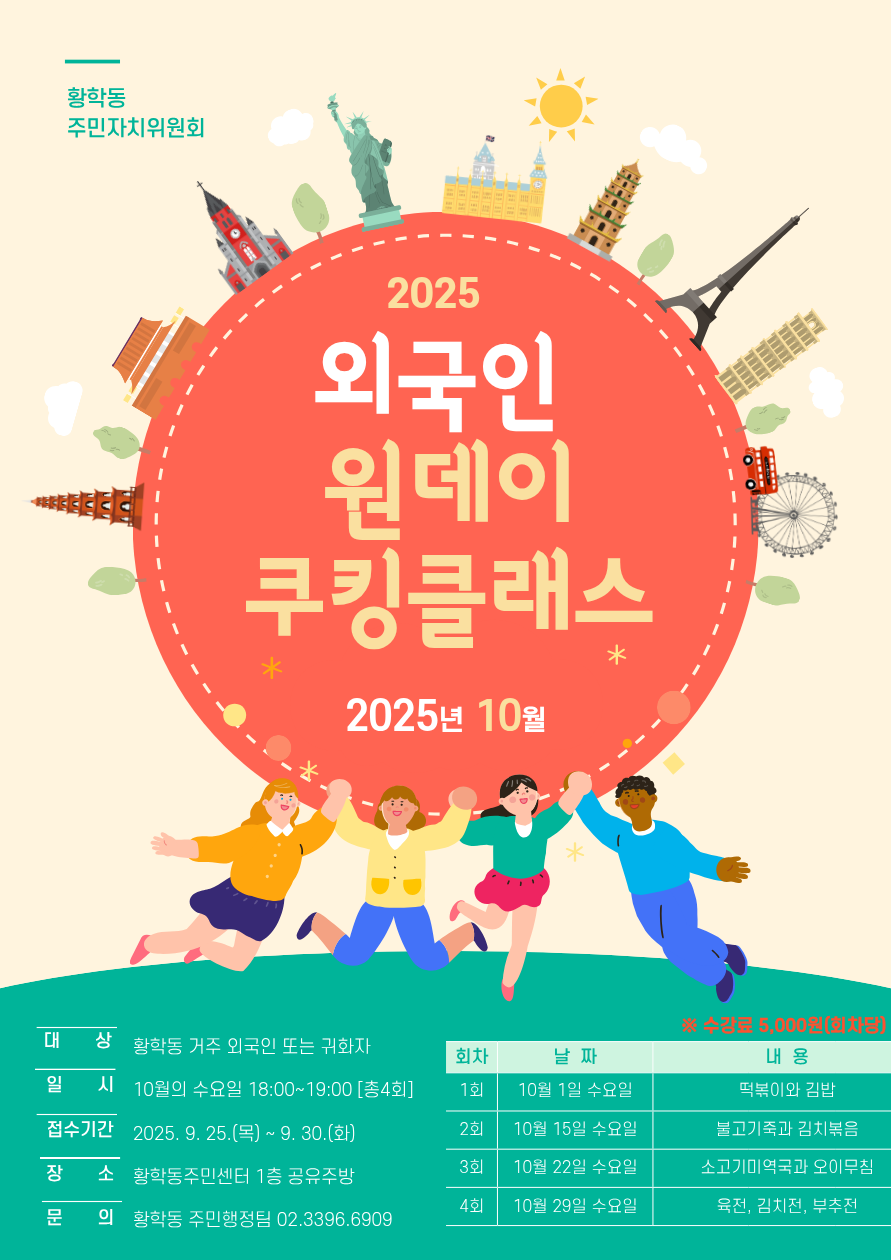 - 내용<외국인 쿠킹 원데이클래스> 모집 안내 ㅇ 기 간 : 2025. 10. 1. ~ 10. 29. [매주 수요일 18:00~19:00, (4회)] ㅇ 장 소 : 황학동주민센터 1층 공유주방 ㅇ 대 상 : 관내 거주하는 외국인 약 10명 ㅇ 운영내용 : 한식 요리교실 및 소통 프로그램 운영 ㅇ 수 강 료 : 20,000원(1회당 5,000원/4회)