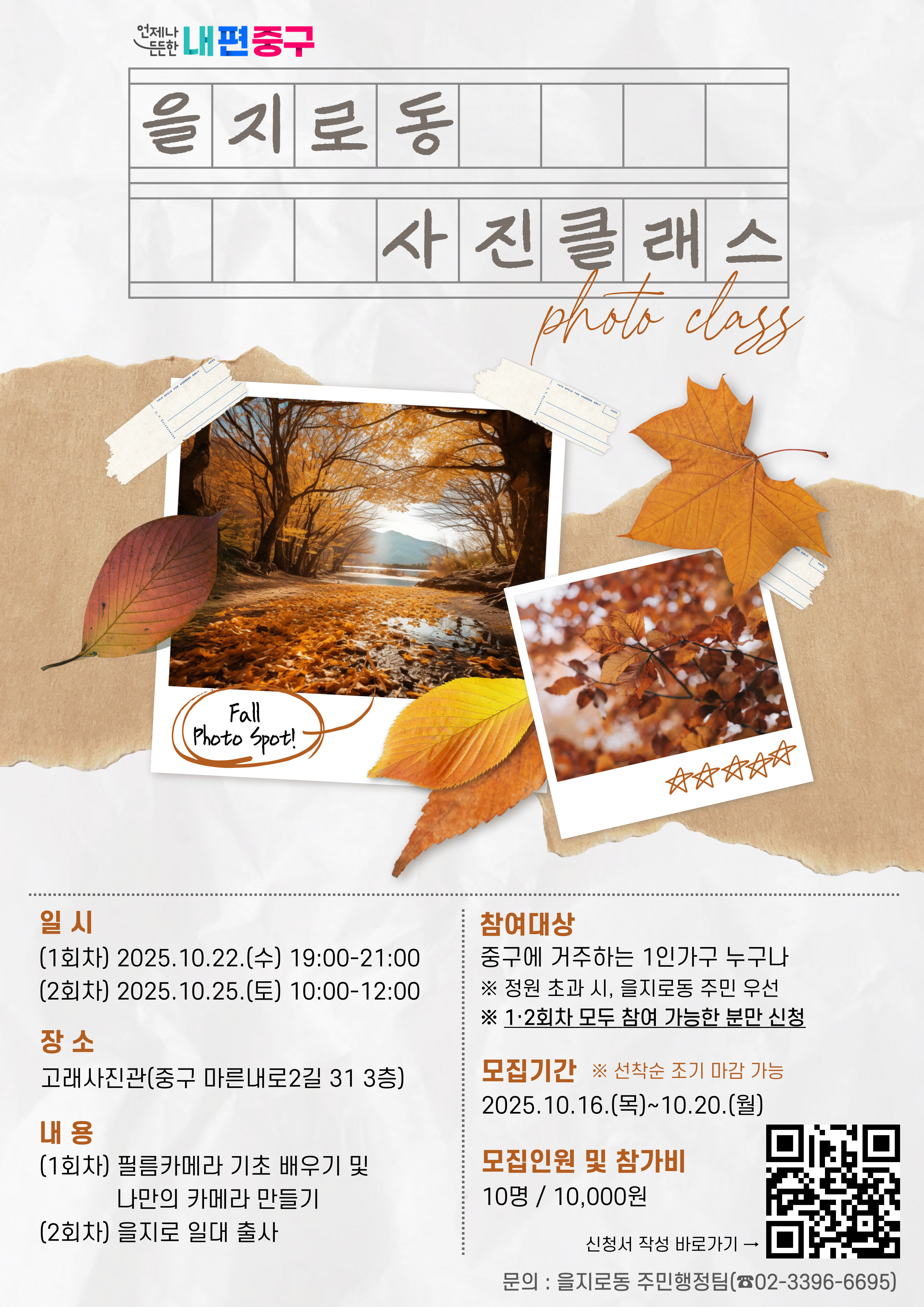 - 내용필름 카메라로 을지로 일대를 촬영하며 몰랐던 우리 동네를 알아갈 수 있는 시간! 을지로동 사진 클래스 참여자를 모집합니다. ○ 일시 (1회차) 2025. 10. 22.(수) 19:00~21:00 (2회차) 2025. 10. 25.(토) 10:00~12:00 ○ 장소 : 고래사진관(중구 마른내로2길 31 3층) ○ 내용 : 필름카메라에 대한 기본 개념을 배우고 나만의 카메라 만들기(1회차) 및 을지로 일대 촬영 실습(2회차) ○ 모집기간 : 2025. 10. 16.(목) ~ 10. 20.(월) ○ 모집인원 : 중구 거주 1인가구 10명 ※ 선착순으로 조기 마감 가능, 정원 초과 시 을지로동 주민 우선 ※ 1·2회차 모두 참여 가능한 분만 신청 바랍니다. ○ 신청방법 : 아래 연결사이트 링크(https://naver.me/xU4eBlA2) 접속하여 신청서 작성 및 제출 ○ 참가비 : 10,000원 ○ 참여자 확정 통보 : 2025. 10. 21.(화)
