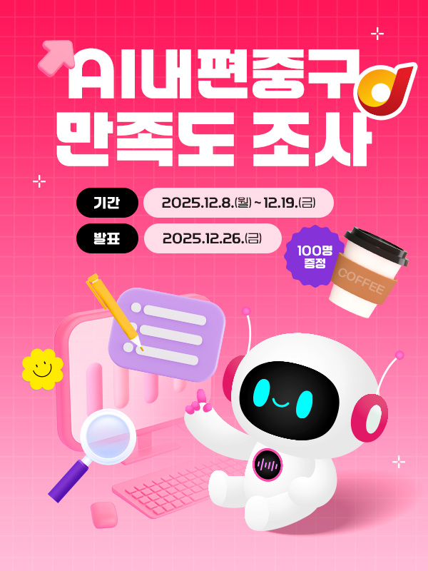 - 내용♥ AI내편중구 만족도 조사 ♥ AI내편중구 운영에 대한 여러분의 의견을 듣고자 합니다. 제출해 주신 답변은 향후 AI내편중구 운영 개선을 위한 소중한 자료로 활용하고자 하오니 많은 참여 부탁드립니다. 참여해 주신 분들 중 100명을 추첨하여 스타벅스 아메리카노 기프티콘을 발송해 드릴 예정입니다. ▶ 참여 기간 : 2025. 12. 8.(월) ~ 12. 19.(금) (2주간) ▶ 참여 대상 : AI내편중구 이용자 ▶ 참여 방법 : 온통중구를 통한 온라인 설문 참여(하단 연결사이트 클릭) ▶ 이벤트 상품 : 스타벅스 아메리카노 기프티콘(추첨 100명) ▶ 당첨자 발표 : 2025. 12. 26.(금) (예정)