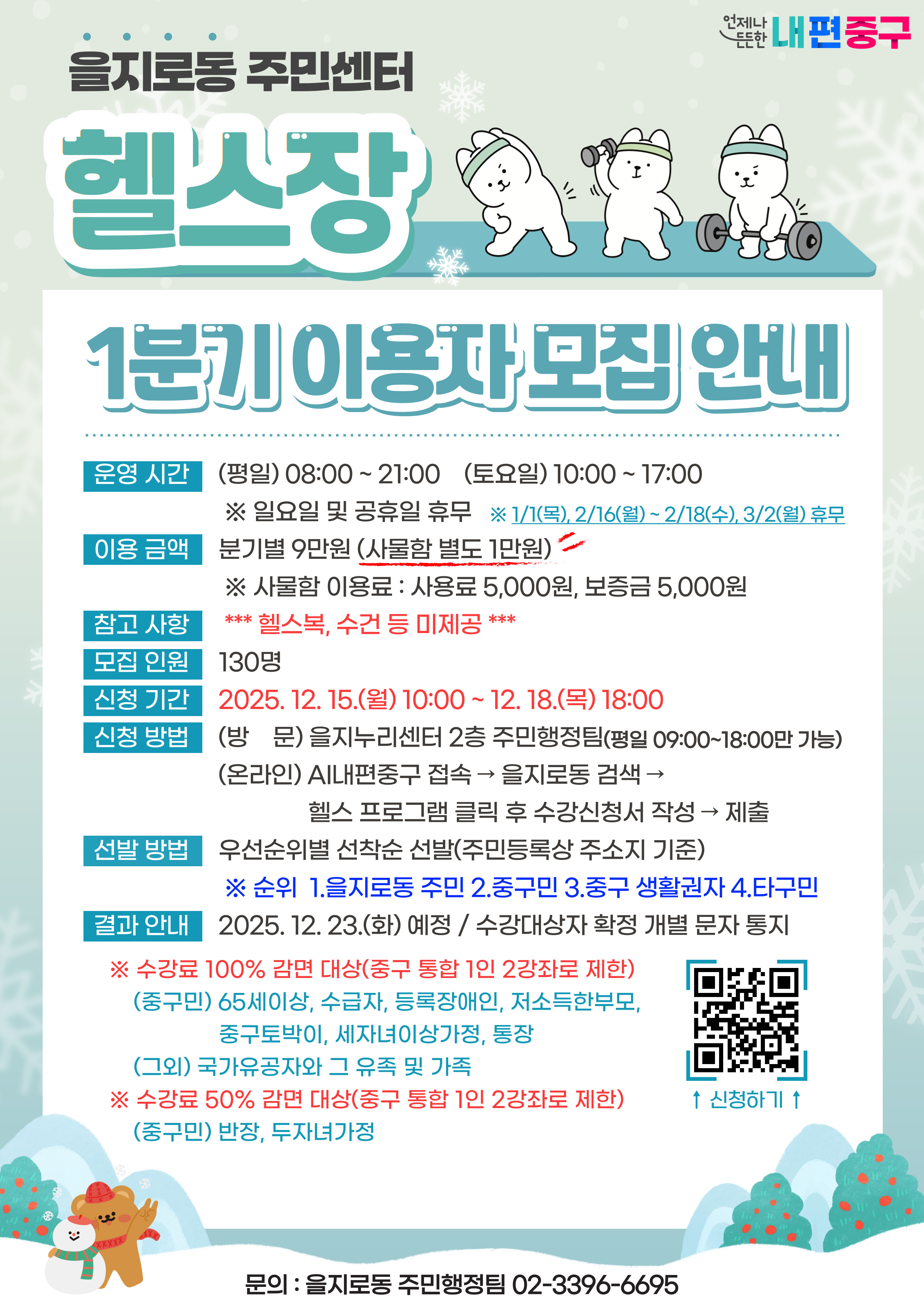- 내용○ 헬스장 운영시간 : (평일) 08:00~21:00, (토요일) 10:00~17:00 ※ 일요일 및 공휴일 휴무[1/1(목), 2/16(월) ~ 2/18(수), 3/2(월) 휴무] ○ 이용금액 : 분기별 90,000원, 사물함 별도 10,000원(사용료 5,000원, 보증금 5,000원) ※ 사물함은 희망자만 금액 지불하시면 됩니다. ○ 모집인원 : 130명(우선순위별 선착순, 주민등록주소지 기준) ※ 선발순위 : 1.을지로동주민 2.중구민 3.중구생활권자 4.타구민 ○ 참고사항 : 헬스복, 수건 미제공 ○ 신청기간 : 2025. 12. 15.(월) 10:00 ~ 12. 18.(목) 18:00 ※ 신청 현황에 따라 접수가 조기 마감될 수 있습니다. ○ 신청방법 : 아래 네이버폼 신청서 작성 제출 또는 주민센터 방문접수(2층 주민행정팀) ★ 방문접수는 평일 주민센터 운영시간(09:00~18:00) 내에만 가능합니다. ○ 신청링크 : https://naver.me/Ig45QaVC ○ 선정방법 : 우선순위에 따른 이용자 선정, 주민등록등본상 주소지 기준 ※ 을지로동 주민 > 중구민 > 중구 생활권자 > 타구민 순(동일순위에서는 신규 우선, 나머지 선착순) ○ 이용자 명단 확정 안내 : 2025. 12. 23.(화) 예정 / 이용자 개별 문자 통보 ○ 사용료 납부 - 납부기간 : 2025. 12. 23.(화) ~ 12. 31.(수) 예정 - 납부방법 : 주민센터 방문 납부(현금, 카드) 또는 계좌이체 - 기간 내 미납 시 수강 포기로 간주
