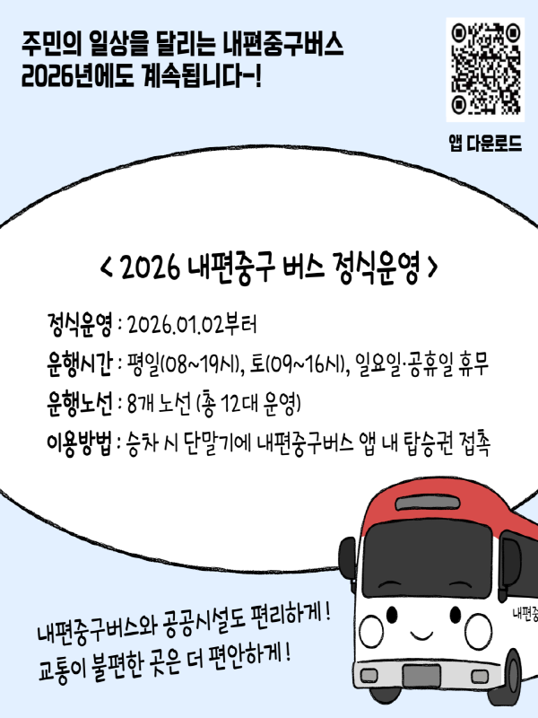 - 내용■ 2026 내편중구버스 정식운영 ㅇ 정식운영 : 2026. 1. 2. 부터 ㅇ 운행시간 : 평일(08~19시), 토(09~16시), 일요일·공휴일 휴무 ㅇ 운행노선 : 8개 노선 (총12대 운영) ㅇ 이용방법 : 승차시 단말기에 내편중구버스 앱 내 탑승권 접촉 ㅇ 배차간격 : 1 · 2 · 3 · 7노선 - 30분(2대) / 4 · 5 · 6 · 8노선 - 60분(1대) ㅇ 이용대상 : 교통약자 및 중구 공공시설 이용자 누구나(거주지 제한 없음) ㅇ 이용료 : 누구나 무료 이용 가능 ㅇ 이용방법 : 1. 내편중구버스 앱에서 탑승권(QR코드) 발급받기 2. 승차 시 단말기에 QR코드 접촉하기 ㅇ 내편중구 앱 다운로드 방법 - 구글플레이스토어(안드로이드·삼성갤럭시), 앱스토어(IOS·아이폰) 검색창에 "내편중구버스"입력 후 앱 다운로드 ㅇ 이용문의 : 중구청 교통행정과(☎02-3396-6203) ※ 운행노선 등 자세한 사항은 아래 연결사이트를 클릭하여 확인해주세요!