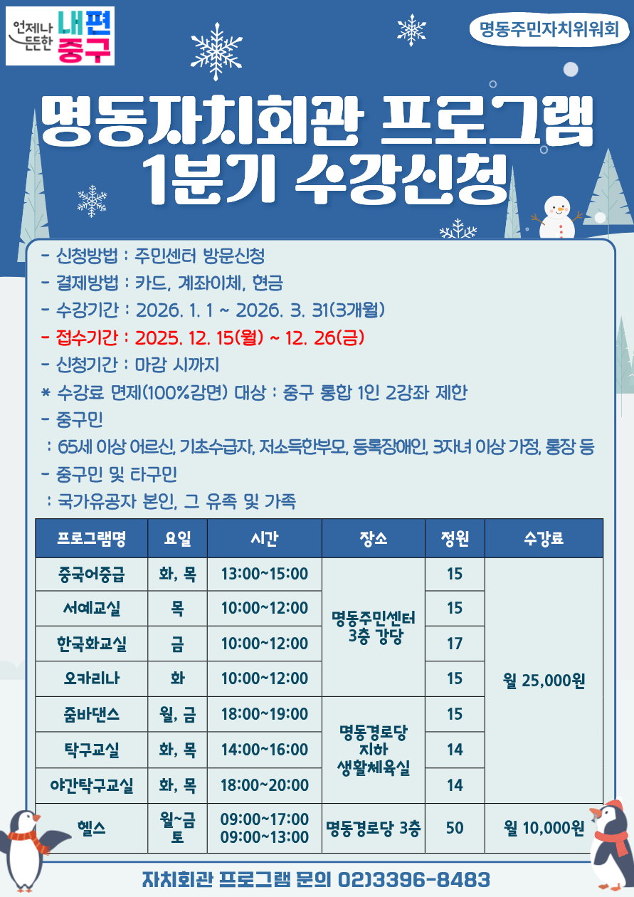 - 내용◎ 수강기간 : 2026. 1. 1. ~ 3. 31. ◎ 장 소 : 명동주민센터 3층 강당/명동경로당 지하 생활체육실, 헬스장 ◎ 신청방법 : 명동주민센터 1층 방문신청 ◎ 수 강 료 : 25,000원(헬스 10,000원)/월 <감면대상자> *증빙서류 필수 구비 ◇ 100% 면제 대상 [중구민] 65세 이상어르신, 등록장애인, 기초생활수급자, 저소득한부모가정, 세자녀이상 가정, 중구 토박이, 통장 [중구민+타구민] 국가유공자 ◇ 50% 면제 대상 [중구민] 중구 반장, 2자녀 가정(막내18세까지)