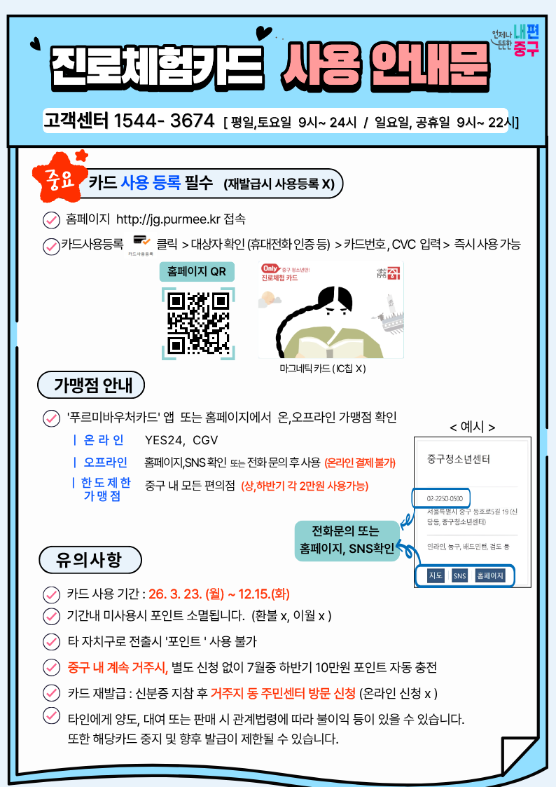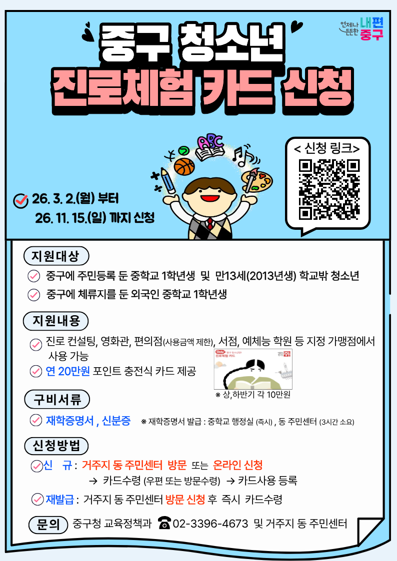 - 내용■ 지원대상 : ① 중구 거주 중학교 1학년생 및 만13세(2013년생) 학교밖 청소년, ②중구에 체류지를 둔 외국인 중학교 1학년생 ■ 신청기간 : 26. 3. 2.(월) ~ 11. 15.(일) → 재학증명서 필수 ■ 카드 사용기간 : 26. 3. 23.(월) ~ 12. 15.(화) ■ 카드 사용처 : http://jg.purmee.kr 에서 가맹점 확인 가능 ※ 재학증명서 발급 안내 : ①중학교 행정실(즉시 발급) 또는 ②동주민센터(최대 3시간 소요) 신청