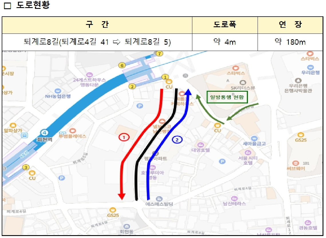 - 내용회현동에 위치한 퇴계로8길 일부 구간의 통행방식 변경에 대해 주민 설무조사를 진행하오니, 많은 참여 바랍니다.