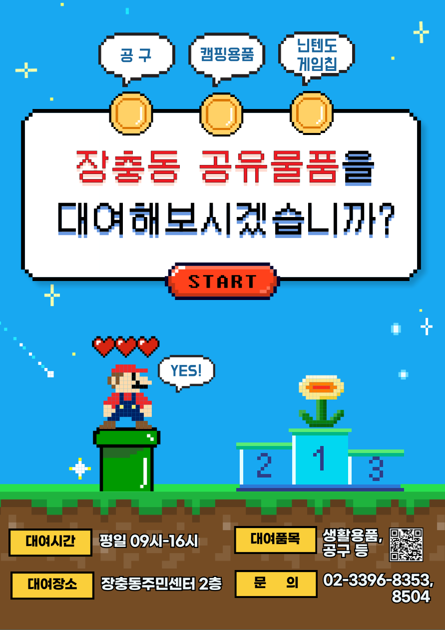 - 내용각종 공구 등을 장충동 자치회관 공유물품 대여소에서 빌려가세요~ 대여료는 무료~1,000원까지 품목별 상이하니, 방문 전 전화로 문의해주세요! (02-3396-8353 또는 8504)