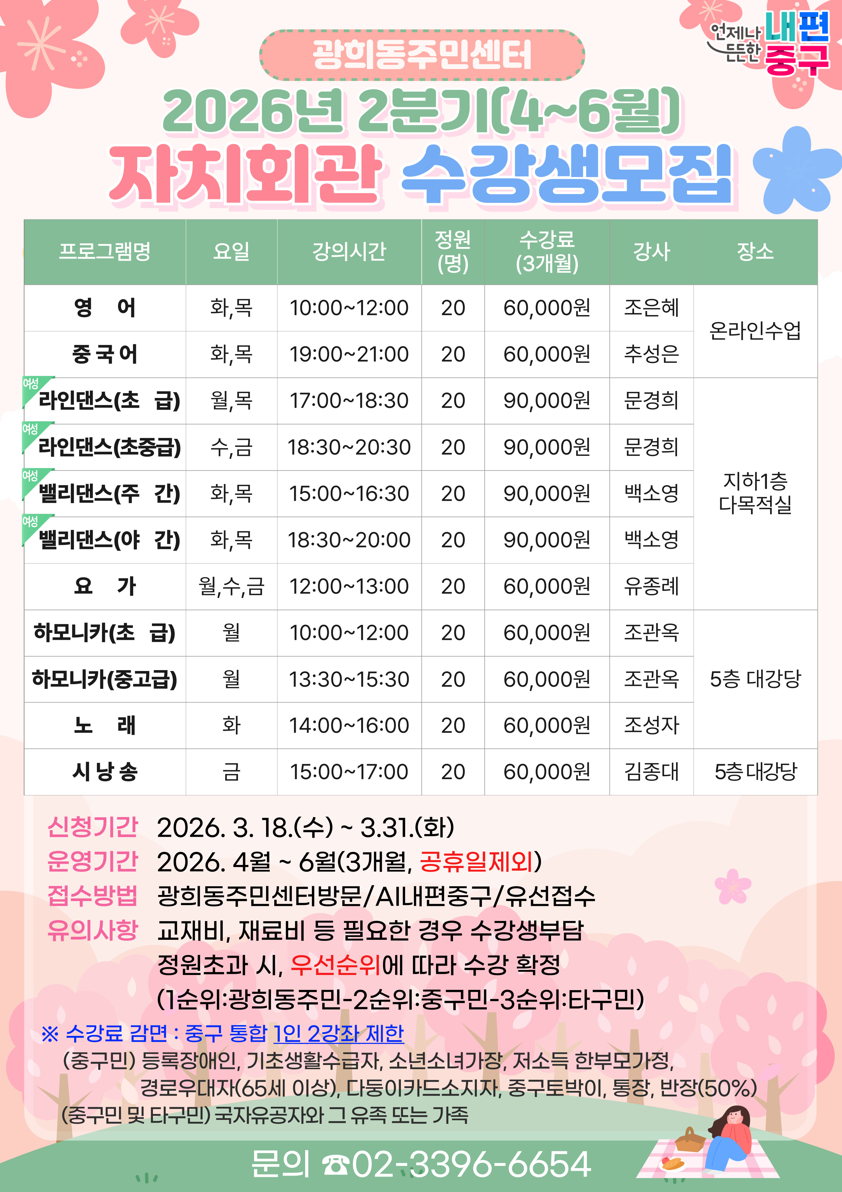 - 내용◯ 수업시간 : 화, 목 10:00 ~ 12:00 ◯ 수업장소 : 온라인 화상수업 ◯ 수 강 료 : 60,000원(3개월) ◯ 참고사항 : 별도 교재 구입 필요 ※ 신청안내 ◯ 접수기간 : 2026. 3. 18.(수) ~ 3. 31.(화) ◯ 신청절차 1) 광희동주민센터 방문접수(09시~18시) 또는 온라인접수(Ai내편중구) ※ 정원 초과 시 우선순위 적용 (광희동 주민 - 중구민 - 타구민 순) 우선순위의 경우, 2026. 3. 18.(수) ~ 3. 31.(화)까지의 접수분에 대해서만 적용 - 1순위 : 광희동 주민(신규 수강생) - 2순위 : 광희동 주민(기존 수강생) - 3순위 : 중구민(신규 수강생) - 4순위 : 중구민(기존 수강생) - 5순위 : 타구민(신규 수강생) - 6순위 : 타구민(기존 수강생) ◯ 수강료 납부 - 납부기간 : 2026. 3. 18.(수) ~ 3. 31.(화) - 납부방법 : 광희동주민센터 방문납부(현금, 카드) 또는 계좌이체 * 계좌번호 : 우리은행 1006-201-334682(예금주 : 광희동주민자치위원회) - 기간내 미납 시 수강 포기로 간주 ◯ 수강료 감면 기준 ※ 2) ~ 7)은 신청 당시 중구 주민등록자 1) 「국가유공자 등 예우 및 지원에 관한 법률」에 따른 국가유공자와 그 유족 또는 가족 2) (중구 주민등록자이면서) 「장애인복지법」에 따라 등록된 장애인 3) (중구 주민등록자이면서) 「국민기초생활 보장법」에 따른 수급자(소년소녀가정 포함) 4) (중구 주민등록자이면서) 「한부모가족 지원법」에 따른 저소득 모·부자 가정 5) (중구 주민등록자이면서) 「노인복지법」에 따른 경로우대자(65세 이상) 6) (중구 주민등록자이면서) 다둥이 행복카드 등 증빙자료 제출한 세 자녀 이상 가정의 부모와 자녀(막내 자녀 나이 18세까지) 7) (중구 주민등록자이면서) 서울 중구 토박이 8) 중구 통장 ◯ 감면대상자의 경우 프로그램 수강료 결제 시 신분증과 증빙서류 제출 - 국가유공자의 경우: 신분증과 국가보훈등록증, 국가유공자유족증, 국가유공자증, 국가유공자증명서 등 국가유공자와 그 유족임을 증명하는 증빙서류 한가지 - 기초생활수급자의 경우 : 신분증과 기초생활수급자증명서 - 장애인의 경우 : 신분증과 장애인 증명서 또는 복지카드 - 저소득 모·부자 가정의 경우 : 신분증과 한부모가족 증명서 - 경로우대자의 경우 : 신분증과 (결제일에 발급받은)주민등록초본 - 중구 토박이의 경우 : 토박이증 ◯ 수강료 감면은 중구 통합 1인 2강좌로 제한(국가유공자 관련 제외). 2강좌 초과 감면 확인 시 환수 등 조치.