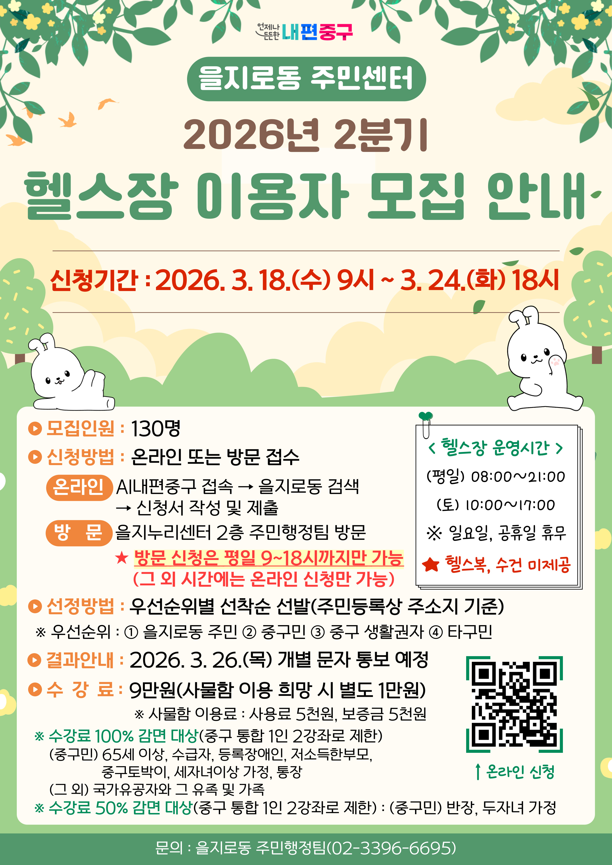 - 내용○ 헬스장 운영시간 : (평일) 08:00~21:00, (토요일) 10:00~17:00 ※ 일요일 및 공휴일 휴무 ○ 이용금액 : 분기별 90,000원, 사물함 별도 10,000원(사용료 5,000원, 보증금 5,000원) ※ 사물함은 희망자만 금액 지불하시면 됩니다. ○ 모집인원 : 130명(우선순위별 선착순, 주민등록주소지 기준) ○ 참고사항 : 헬스복, 수건 미제공 ○ 신청기간 : 2026. 3. 18.(수) 09:00 ~ 3. 24.(화) 18:00 ※ 신청 현황에 따라 접수가 조기 마감될 수 있습니다. ○ 신청방법 : 온라인 신청서(https://naver.me/Fso25Hh6) 작성 제출 또는 주민센터 방문접수(2층 주민행정팀 방문, 평일 18시까지만 가능) ○ 선정방법 : 우선순위에 따른 이용자 선정, 주민등록등본상 주소지 기준 ※ 을지로동 주민 > 중구민 > 중구 생활권자 > 타구민 순(동일순위에서는 신규 우선, 나머지 선착순) ○ 이용자 명단 확정 안내 : 2026. 3. 26.(목) 예정 / 이용자 개별 문자 통보 ★ 감면대상자의 경우, 사용료 납부 시 신분증과 증빙서류 제출(서류로 증빙되어야 감면 가능) 또는 행정정보공동이용 사전동의 필요