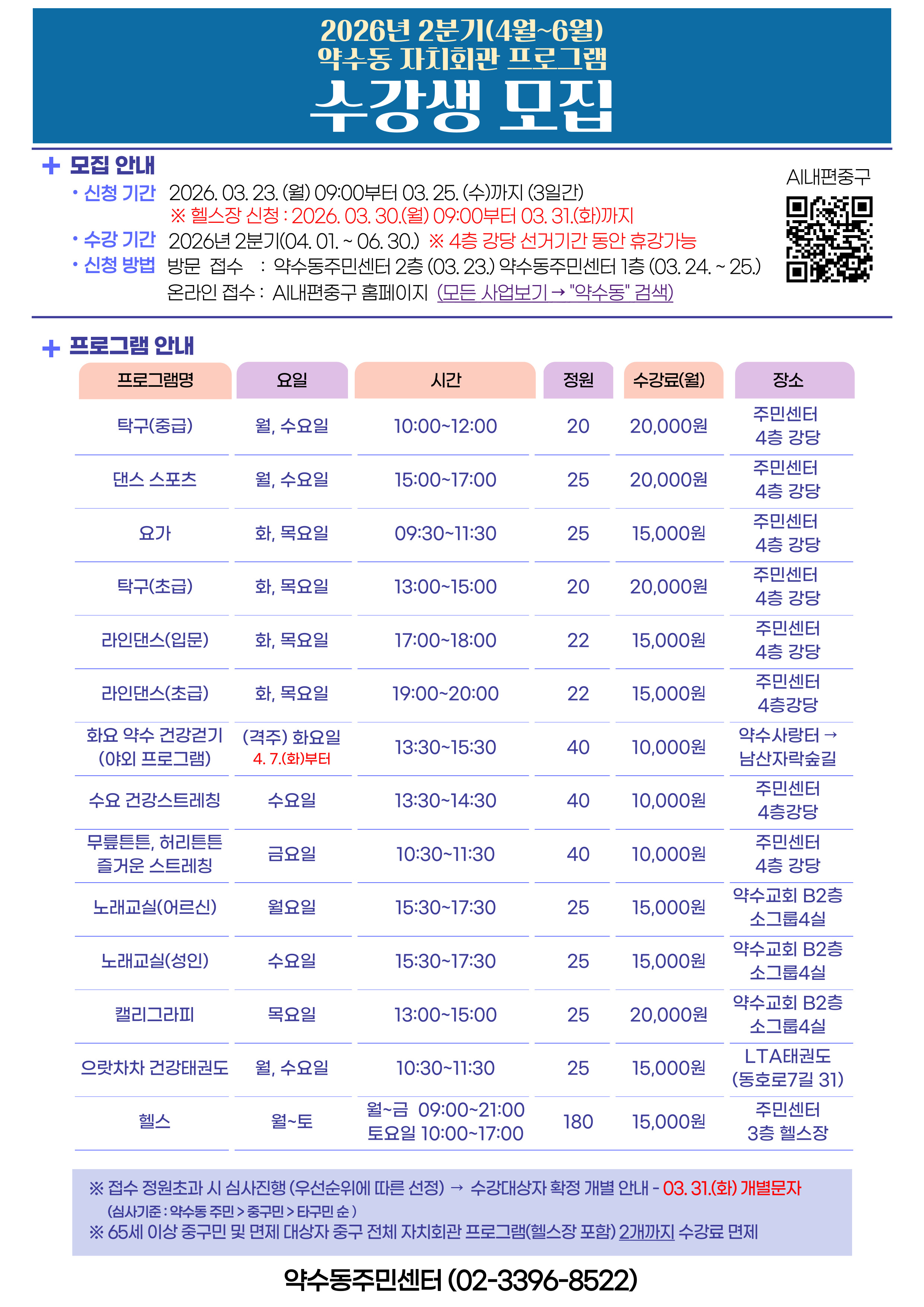 - 신청절차★2026. 2분기(4월~6월)★ 1. 접수일 : 3월23일(월) 9:00부터 3월25일(수) 18:00까지(3일간) 2. 신청방법 - 온라인 접수(AI내편중구) : 3.23.(월) 9:00부터 수강신청 버튼 생성 - 방문 접수 : 23일-주민센터 2층 로비 / 24,26일-1층 주민행정팀 3. 프로그램 정원초과 접수 시 심사 후 등록여부 결과안내 : 2026. 3. 31.(화) 개별 통보 4. 등록문자 받으신 분은 방문결제 또는 계좌이체 후 프로그램 수강 확정