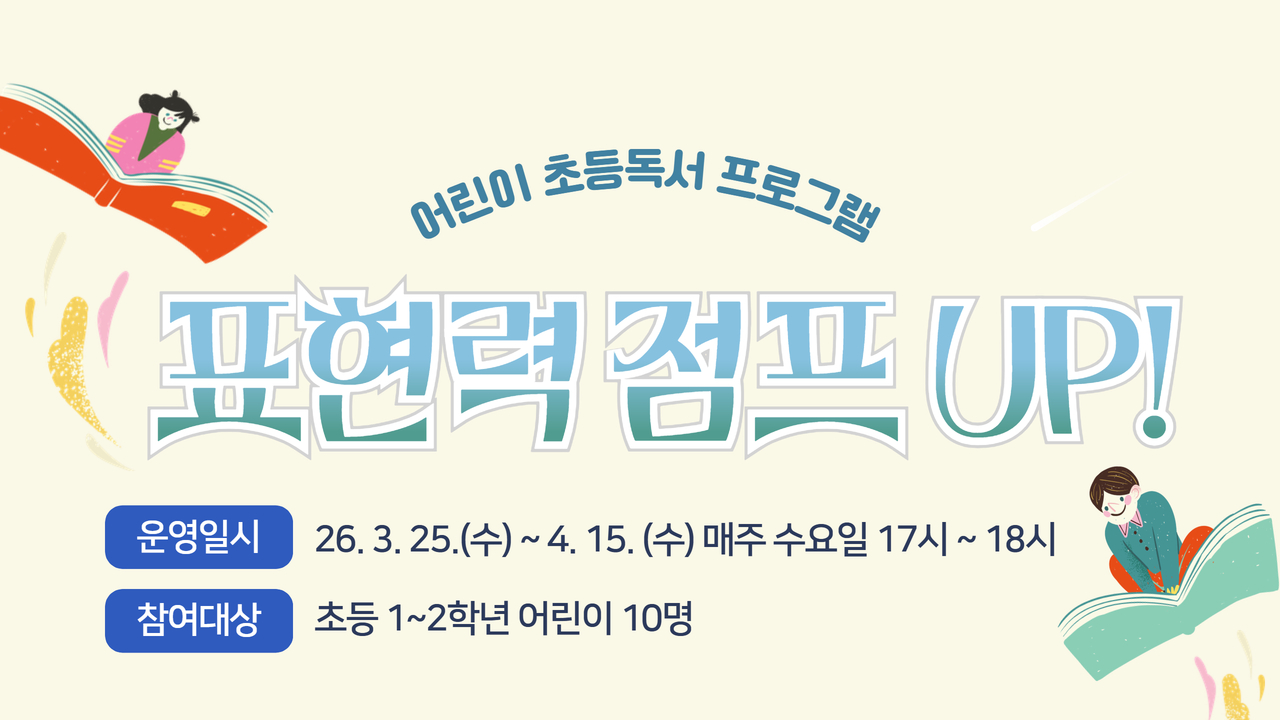 - 내용 !! 참여 어린이 이름으로 신청해주세요! 부모님 아이디로 신청시 참여 어린이의 이름과 학년을 알려주세요 !! 초등 저학년 문해력 프로그램 <표현력 점프UP!> 장충동작은도서관에서 책읽기와 글쓰기를 통해 사고력을 확장하고 자신의 생각을 조리있게 말하는 방법을 배울 수 있는 초등 독서 프로그램 <표현력 점프UP!>을 운영합니다! ◇ 운영일시 : 2026. 3. 25.(수) ~ 4. 15.(수) 17:00~18:00 (총4회) ◇ 참여대상 : 초등 1-2학년 10명 ◇ 운영장소 : 장충동작은도서관 상상이룸 ◇ 문의전화 : 02-2230-2972 ※유의사항※ ! 프로그램 참여시 개인정보 동의와 사진 촬영 및 사용에 동의 한다는 것으로 간주합니다. !! 참여 어린이 이름으로 신청해주세요! 부모님 아이디로 신청시 참여 어린이의 이름과 학년을 알려주세요 !!
