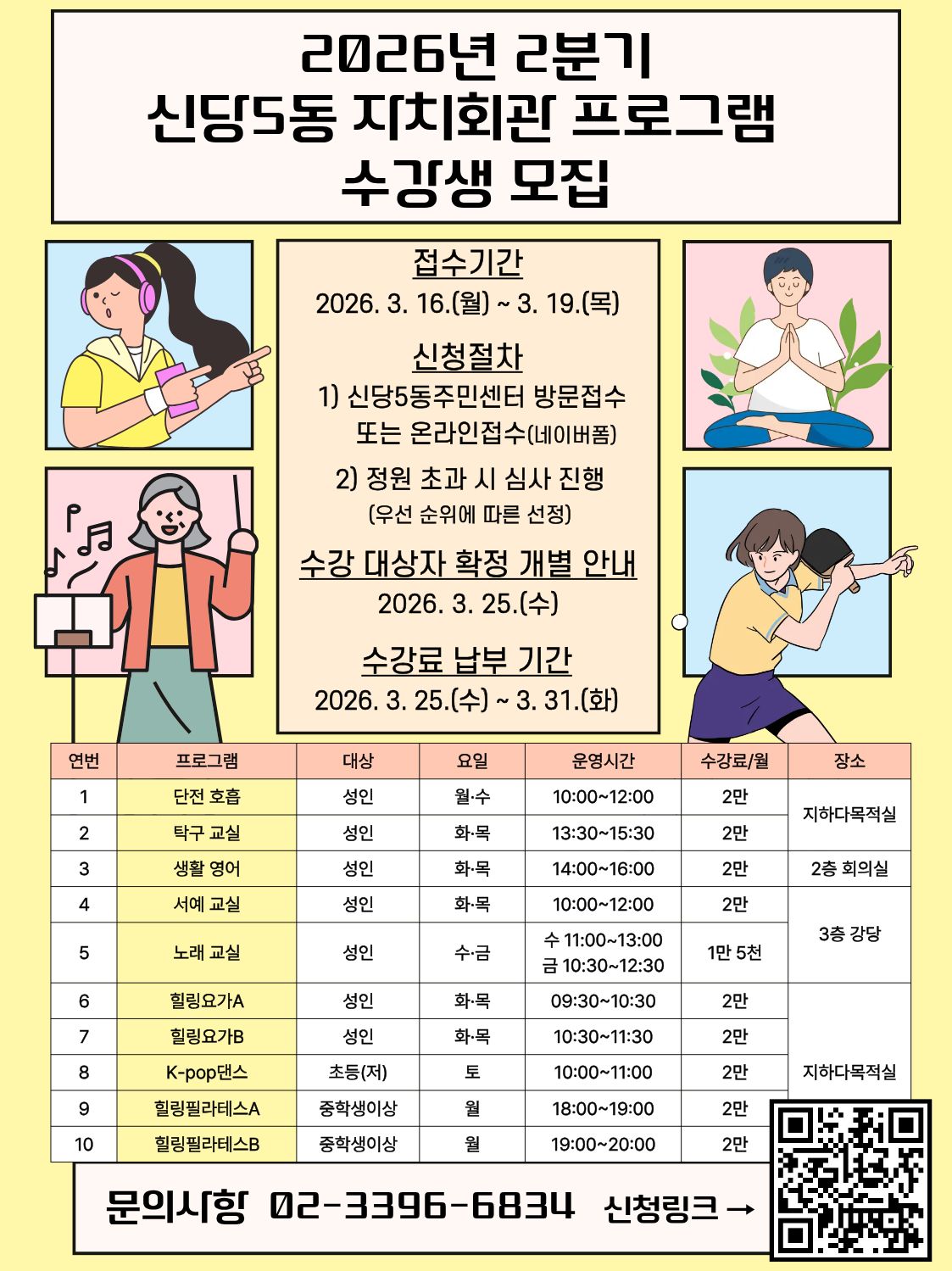 - 신청절차 ▶ 신청절차 1) 신당5동주민센터 방문접수(09시~18시) 또는 온라인접수(네이버폼/ 링크: https://naver.me/FAAZlg32 ) 2) 정원 초과 시 심사 진행(우선 순위에 따른 수강생 선정, 주민등록 기준)