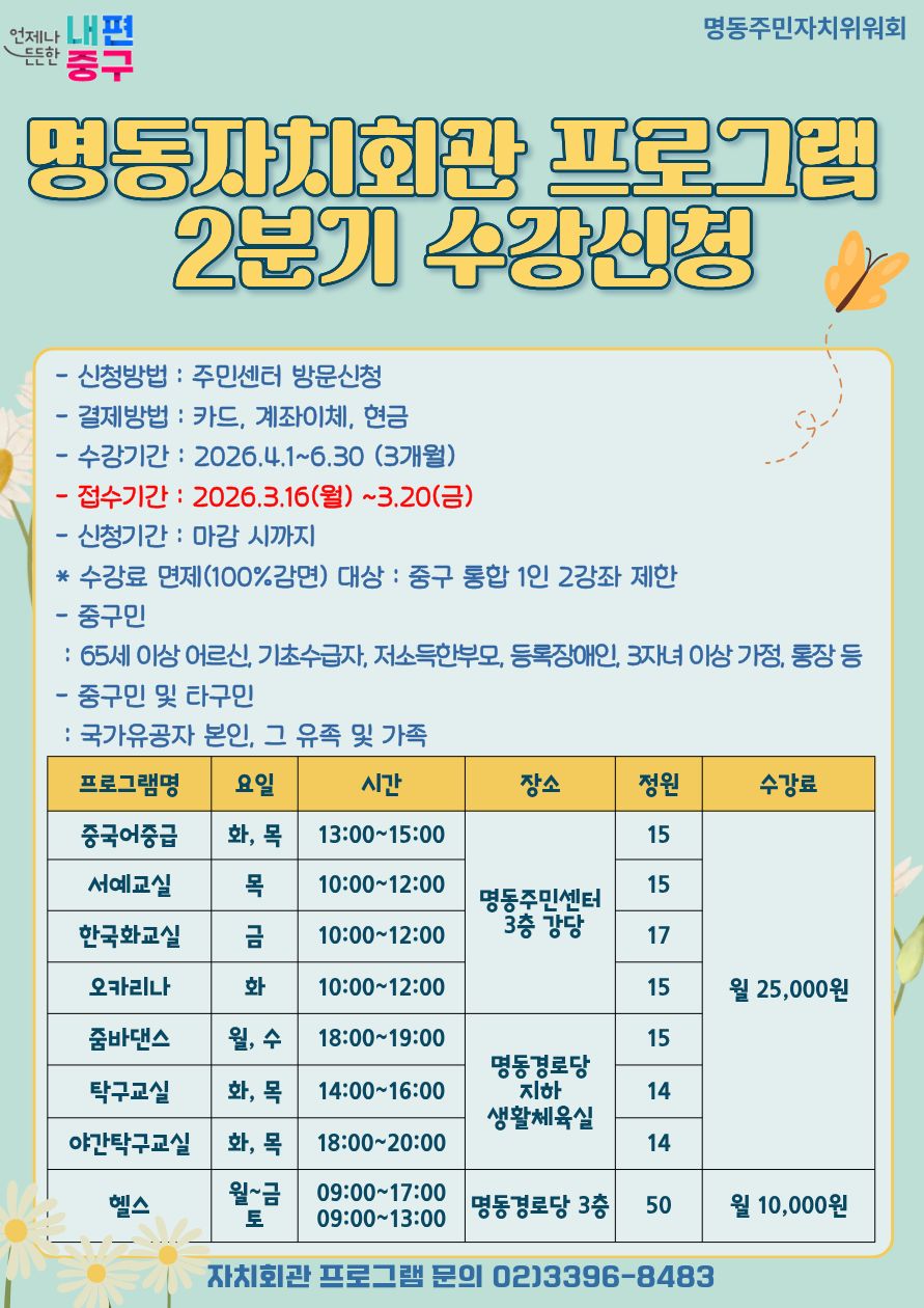- 내용◎ 수강기간 : 2026. 4. 1. ~ 6. 30. ◎ 장 소 : 명동주민센터 3층 강당/명동경로당 지하 생활체육실, 헬스장 ◎ 신청방법 : 명동주민센터 1층 방문신청 ※ 정원 초과 접수 시 우선순위에 따라 접수 순위 부여 (1순위: 명동주민 - 2순위: 중구민 – 3순위: 중구생활권자 – 4순위: 타구민) ◎ 수 강 료 : 25,000원(헬스 10,000원)/월 <감면대상자> *증빙서류 필수 구비 ◇ 100% 면제 대상 [중구민] 65세 이상어르신, 등록장애인, 기초생활수급자, 저소득한부모가정, 세자녀이상 가정, 중구 토박이, 통장 [중구민+타구민] 국가유공자 ◇ 50% 면제 대상 [중구민] 중구 반장, 2자녀 가정(막내18세까지)