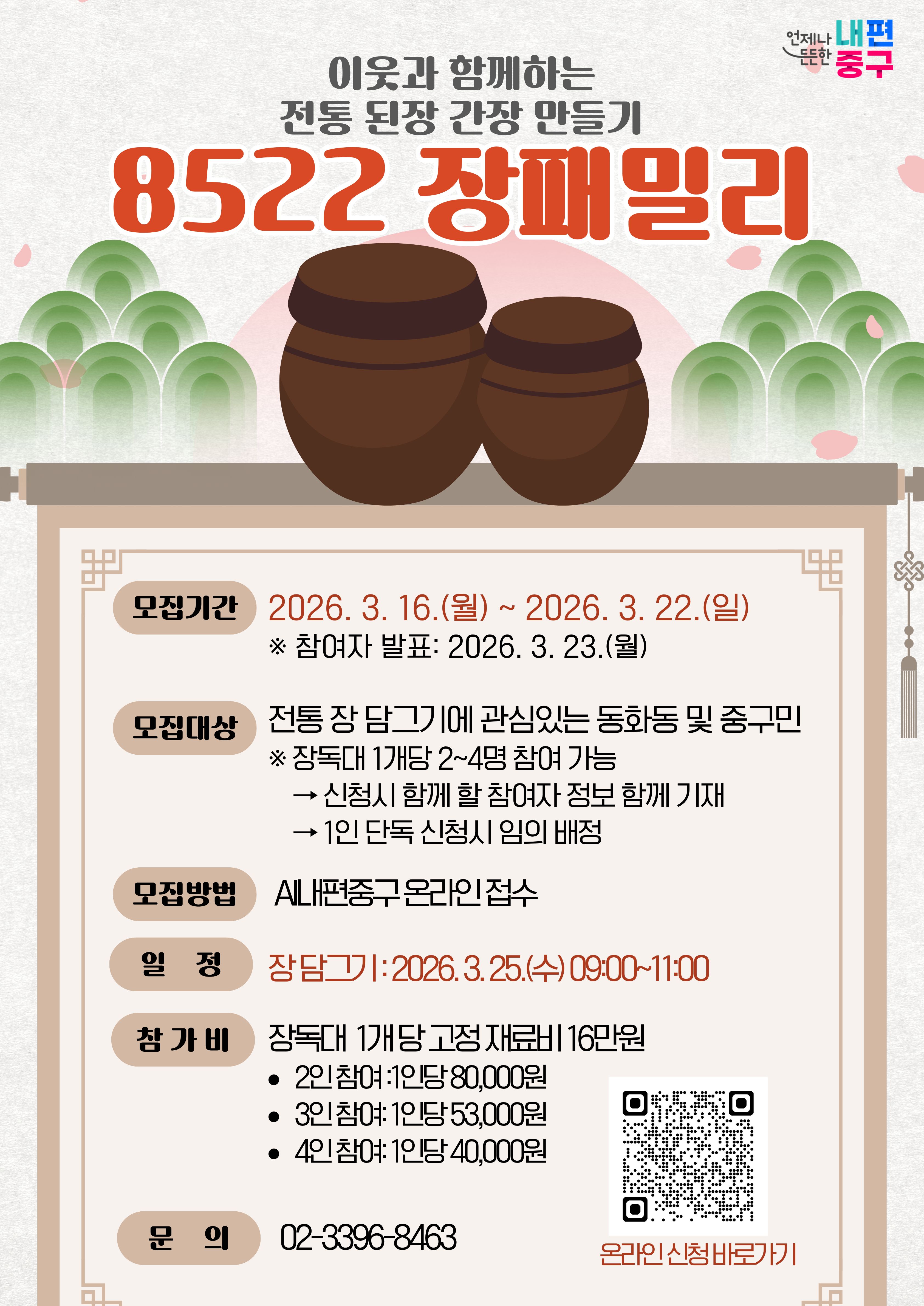 - 내용< 8522 장패밀리 > 이웃 가족들과 전통 된장, 간장을 담그고, 즐겁게 소통하면서 동화같은 삶을 만들어보세요. - 신청기간: 2026. 3. 16.(월) ~ 3. 22.(일) ※ 참여 확정 안내: 2026. 3. 23.(월) - 모집대상: 동화동 주민 및 중구민(우선순위: ① 만 65세 이상 어르신 → ② 직전 1년 미참여자 → ③ 선착순) - 참가비 : 4~8만원(장독대 1개당 조 인원에 따라 상이) ★ 일정안내 ★ - 3. 25.(수) 09:00 ~ 11:00 : 장 담그기 - 5. 20.(수) 09:00 ~ 11:00 : 장 나누기 - 6. 10.(수) ~ 11.11.(수) : 2주마다 장 관리하기(자율) - 11.18.(수) 09:00 ~ 11:00 : 장 수확하기