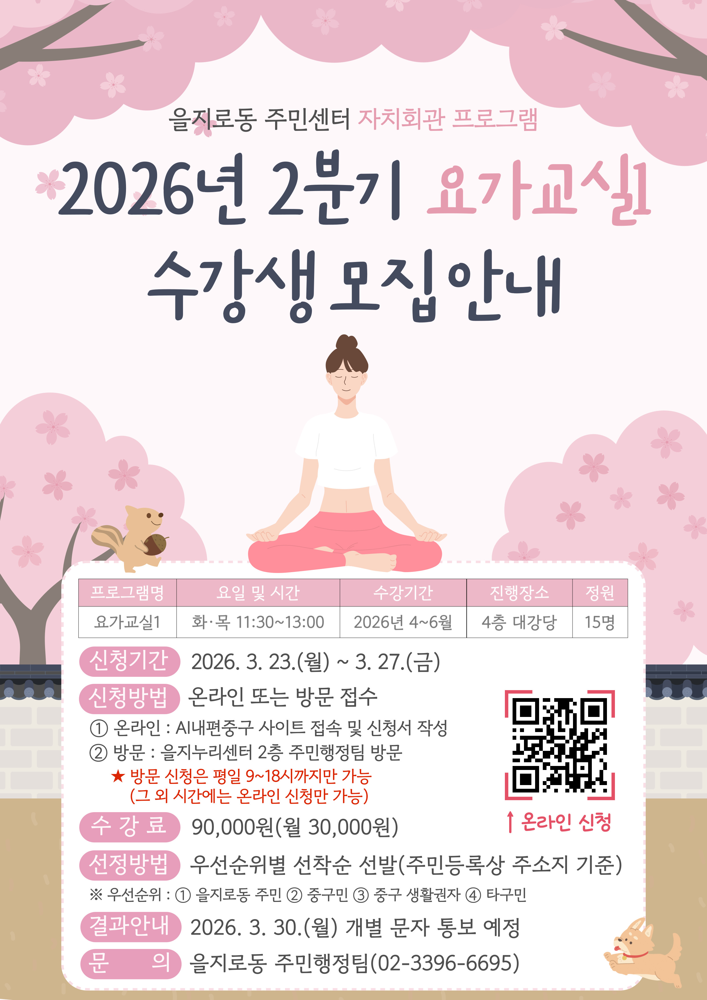 - 내용○ 신청기간 : 2026. 3. 23.(월) 09:00 ~ 3. 27.(금) 18:00 ※ 신청 현황에 따라 접수가 조기 마감될 수 있습니다. ○ 신청방법 : 네이버폼 신청서(https://naver.me/FLEMq20j) 작성 제출 또는 주민센터 방문접수(2층 주민행정팀 방문, 평일 9~18시만 가능) ○ 선정방법 : 우선순위에 따른 이용자 선정, 주민등록등본상 주소지 기준 ※ 을지로동 주민 > 중구민 > 중구 생활권자 > 타구민 순(동일순위에서는 신규 우선, 나머지 선착순) ○ 이용자 명단 확정 안내 : 3.30.(월) 예정 ○ 감면대상자의 경우, 사용료 납부 시 신분증과 증빙서류 제출(서류로 증빙되어야 감면 가능) 또는 행정정보공동이용 사전동의 필요 ※ 사용료 감면은 중구 통합 1인 2강좌로 제한(국가유공자 관련 제외), 2강좌 초과 감면 확인 시 환수 등 조치