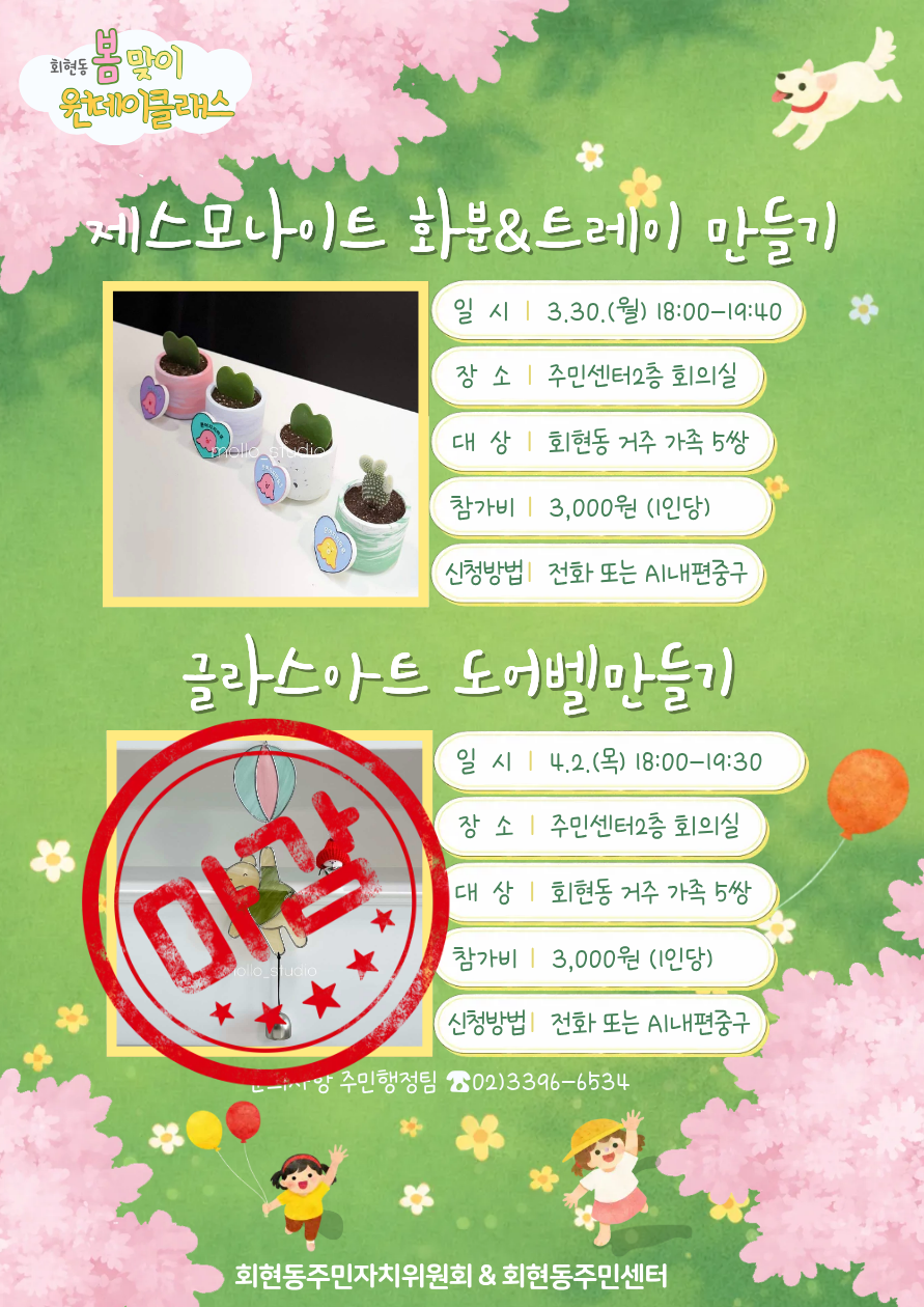 - 내용<<회현동 봄맞이 원데이클래스>> 봄을 맞아 가족단위 원데이클래스를 모집합니다! 수업별 선착순 5쌍(총 10명) 모집하니 많은 참여부탁드립니다. ★글라스아트 도어벨은 선착순 마감되었습니다★