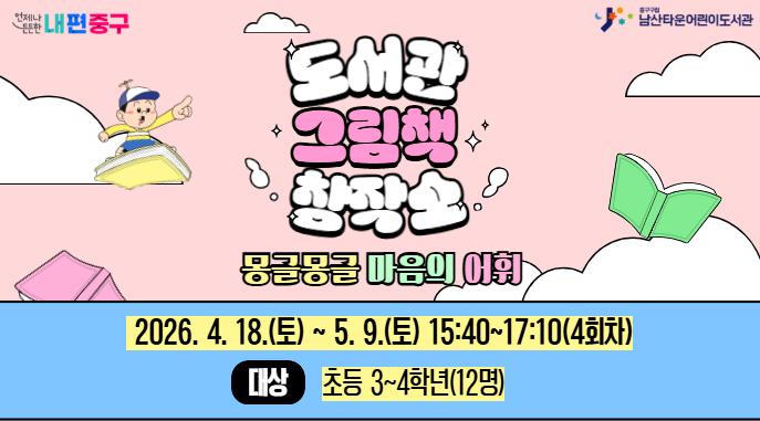 - 내용 <도서관 그림책 창작소> 도란도란 어휘 놀이터 1. 일 시 : 2026. 4. 18. ~ 5. 9. 매주 토요일 15:40~17:10 (4회차) 2. 장 소 : 남산타운어린이도서관 3층 달님실 3. 대 상 : 초등 3~4학년 12명 4. 내 용 : 재미있는 독후활동을 통해 다양한 감정 어휘를 탐구하고, 나의 감정을 글과 그림으로 표현하여 책을 만들어요! 5. 접 수 : 중구구립도서관 홈페이지 선착순 신청 (중구민 우선 접수) ※보호자 아이디로 신청시 [참여동기] 란에 [어린이 이름/나이]를 기재해 주세요. ※ 중구민 우선 접수 받습니다. (타구민 신청 시 자동 대기 접수 됩니다.) ※ 프로그램은 자녀분 회원 아이디로 신청 부탁드립니다. ※ 자녀분 회원 아이디가 없을 경우 프로그램 신청시 참여동기 부분에 자녀나이와 이름을 꼭 적어주세요! ※ 프로그램 참여 시 홍보에 활용될 사진 촬영에 동의하는 것으로 간주합니다. ※ 잦은 결석, 지각, 노쇼, 수업 방해 행위 발생 시 추후 프로그램 신청에 제한이 있을 수 있습니다. ※ 문의 02-2230-2941