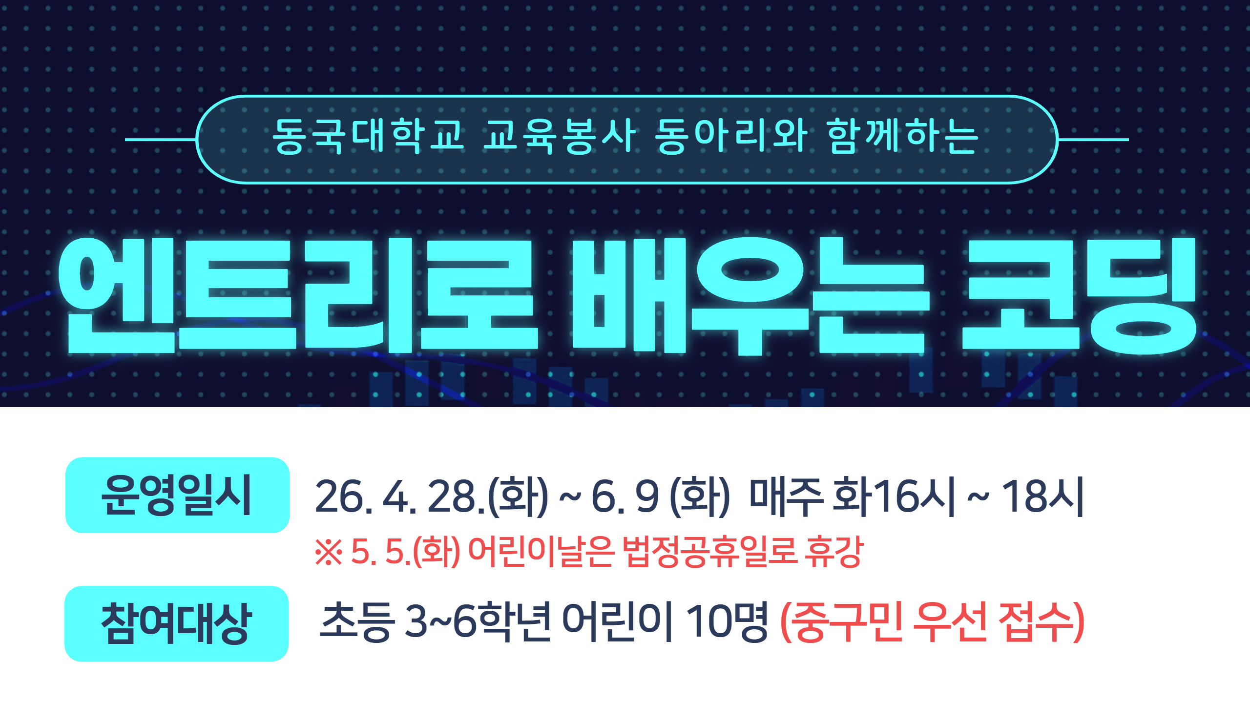 - 내용!! 보호자 이름으로 신청 시 참여동기에 어린이 이름과 학년을 반드시 적어주세요 !! 동국대학교 연계 재능기부 프로그램 <엔트리로 배우는 코딩> ◇ 운영일시 : 2026년 4월 28일(화) ~ 6월 9일(화) 매주 화요일 16시 ~ 18시 ※ 5월 5일(화) 어린이날은 법정공휴일로 휴강 ◇ 참여대상 : 초등 3~6학년 어린이 10명(중구민 우선 접수) ◇ 운영장소 : 장충동작은도서관 상상이룸 ◇ 운영내용 : 네이버 코딩 창작 플랫폼 엔트리의 기본 조작법을 익히고 게임을 만들어 보면서 쉽고 재미있게 코딩을 배울 수 있는 실습 중심 어린이 코딩 프로그램 ◇ 신청기간 : 2026년 4월 18일(토) ~ 마감시 ◇ 신청방법 : 중구구립도서관 홈페이지 선착순 접수 ※ 6차시 모두 참여가능하신 분만 신청해주세요. ※ 보호자 이름으로 신청시 참여 동기에 아이 이름(학년) 필수 기재 ※ 프로그램 신청 시 사진촬영에 동의한 것으로 간주합니다.